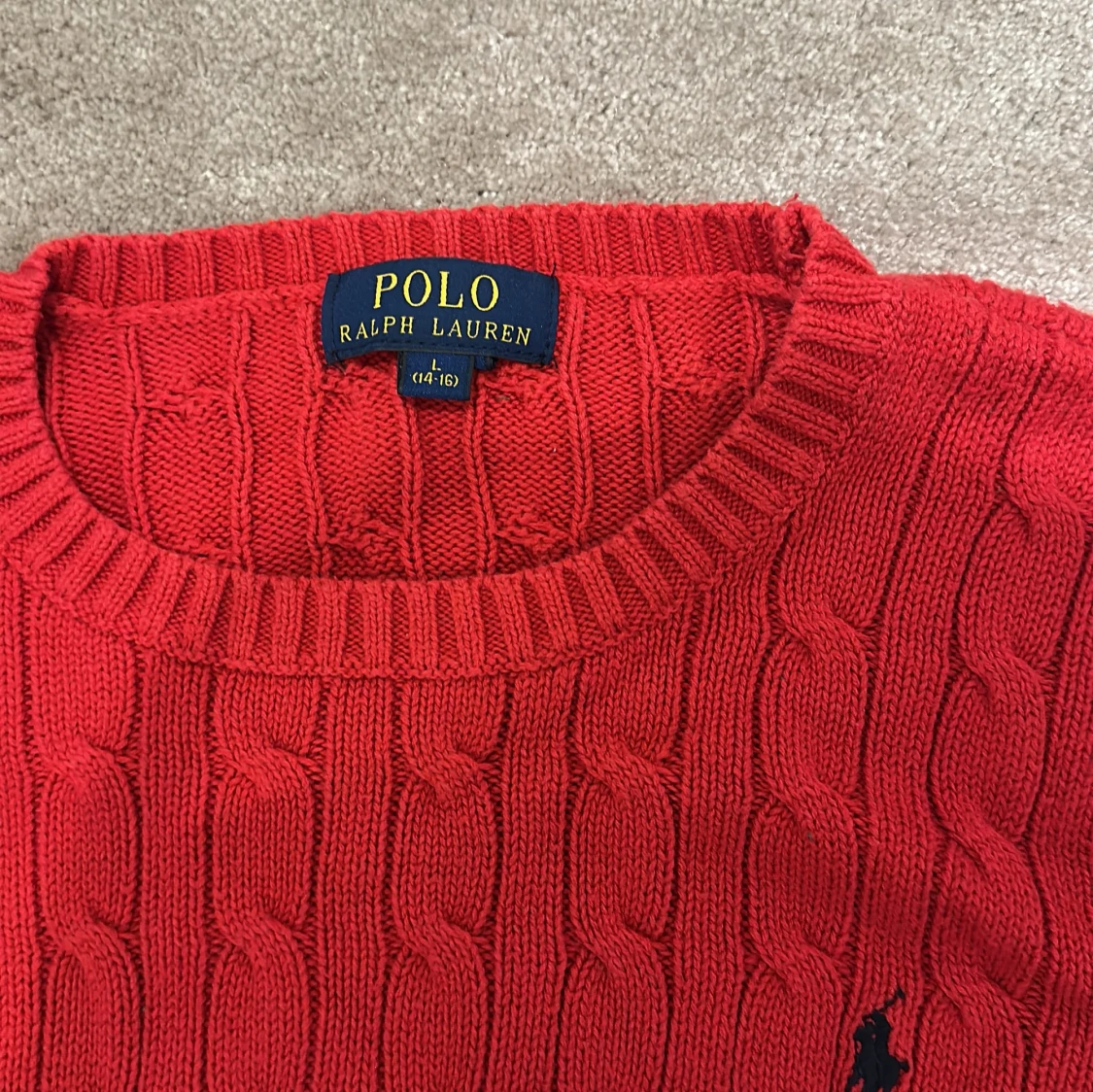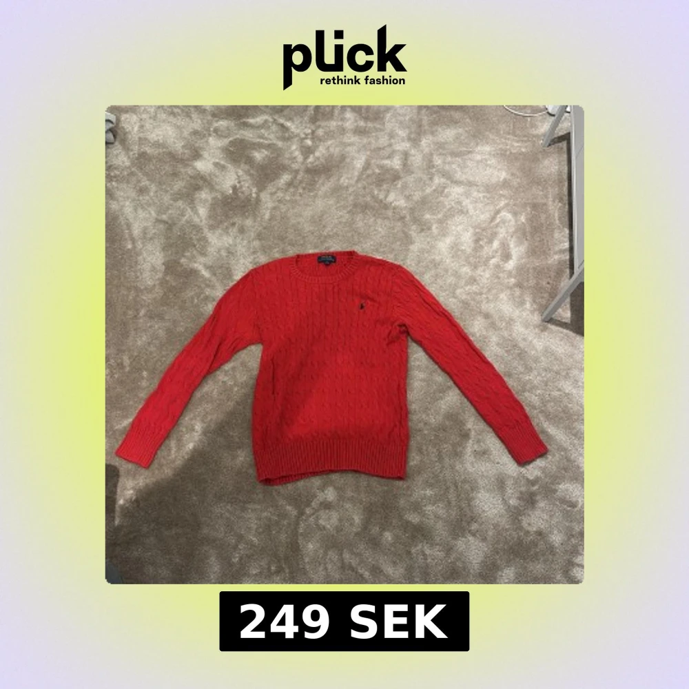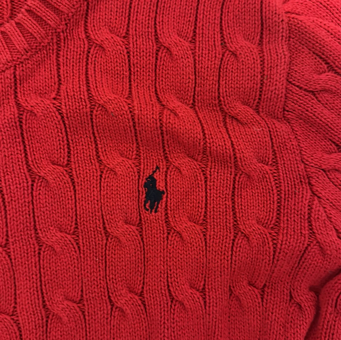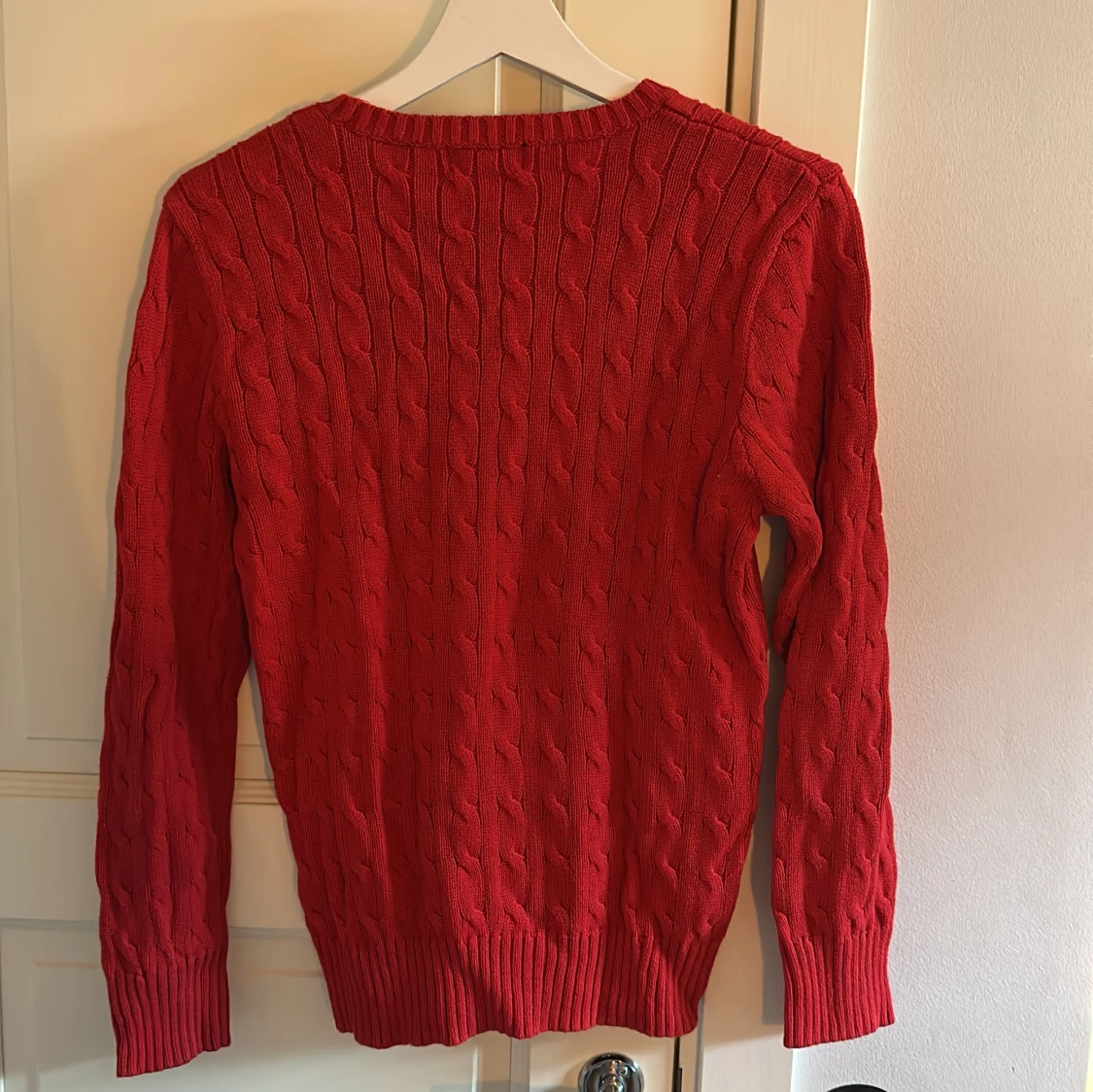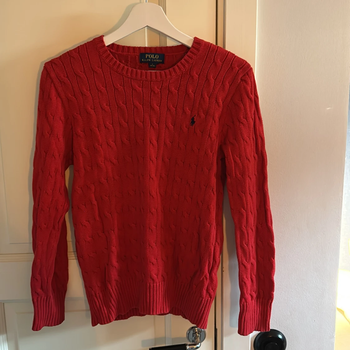Skick: 9/10, knappt använd. Säljer en röd kabelstickad tröja från Polo Ralph Lauren med klassisk rund hals och broderad marinblå logga på bröstet. Tröjan har långa ärmar och ribbade muddar vid ärmslut och nederkant. Perfekt för dig som gillar preppy stil och vill ha något snyggt och bekvämt.