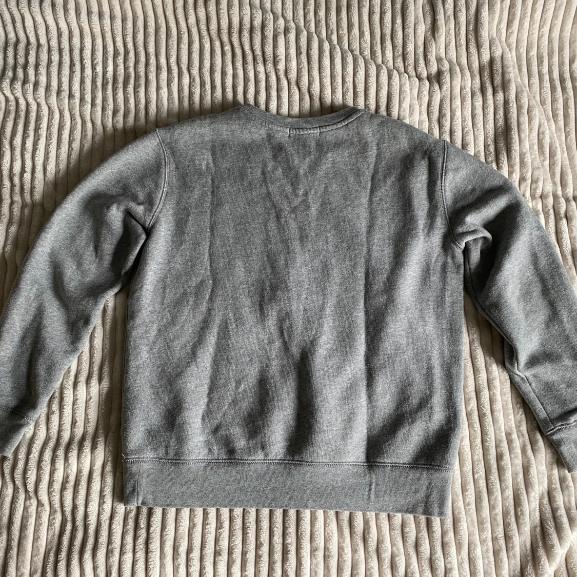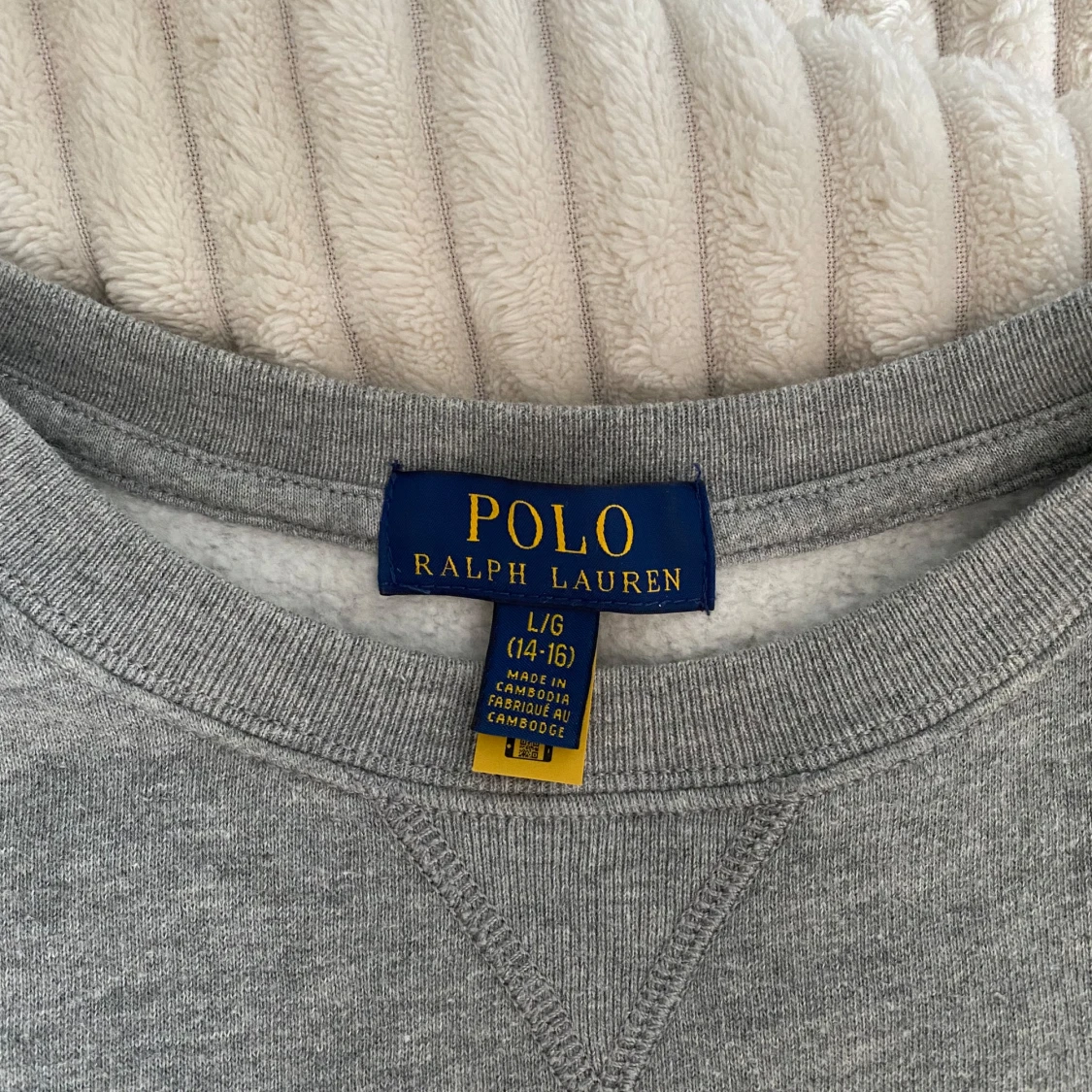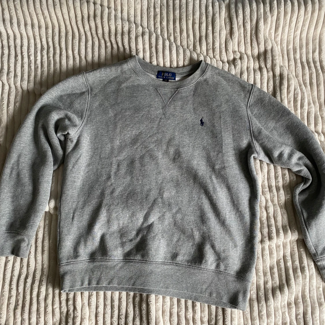 Klassisk grå sweatshirt från Polo Ralph Lauren med rund halsringning och broderad marinblå logga på bröstet. Tröjan har långa ärmar och ribbade muddar vid ärmslut och nederkant. Perfekt för en chill och stilren look. Kommer från ett hem med katt. Hör av dig om du har några frågor!