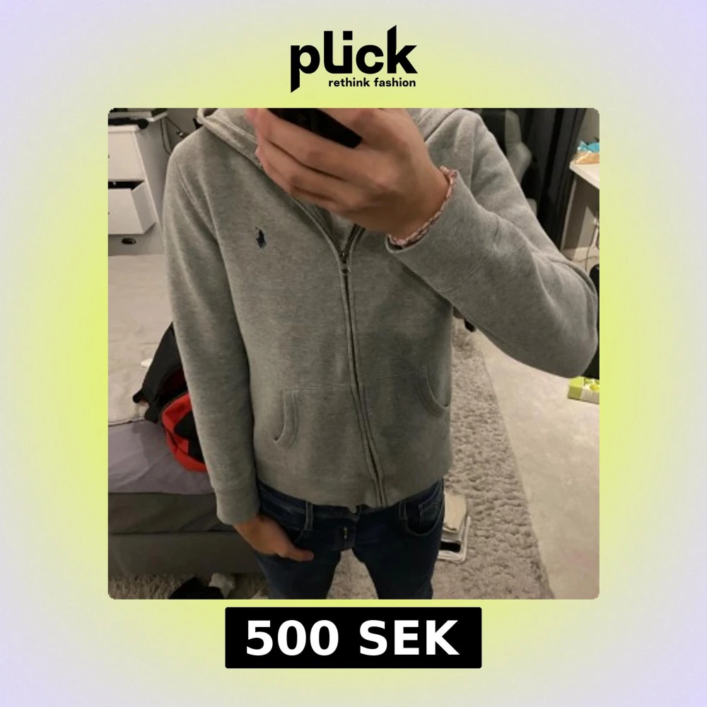 Säljer en stilren grå hoodie från Polo Ralph Lauren med dragkedja och huva. Tröjan har två fickor framtill och klassisk blå logga broderad på bröstet. Perfekt för chill dagar och enkel att matcha med jeans eller joggers.