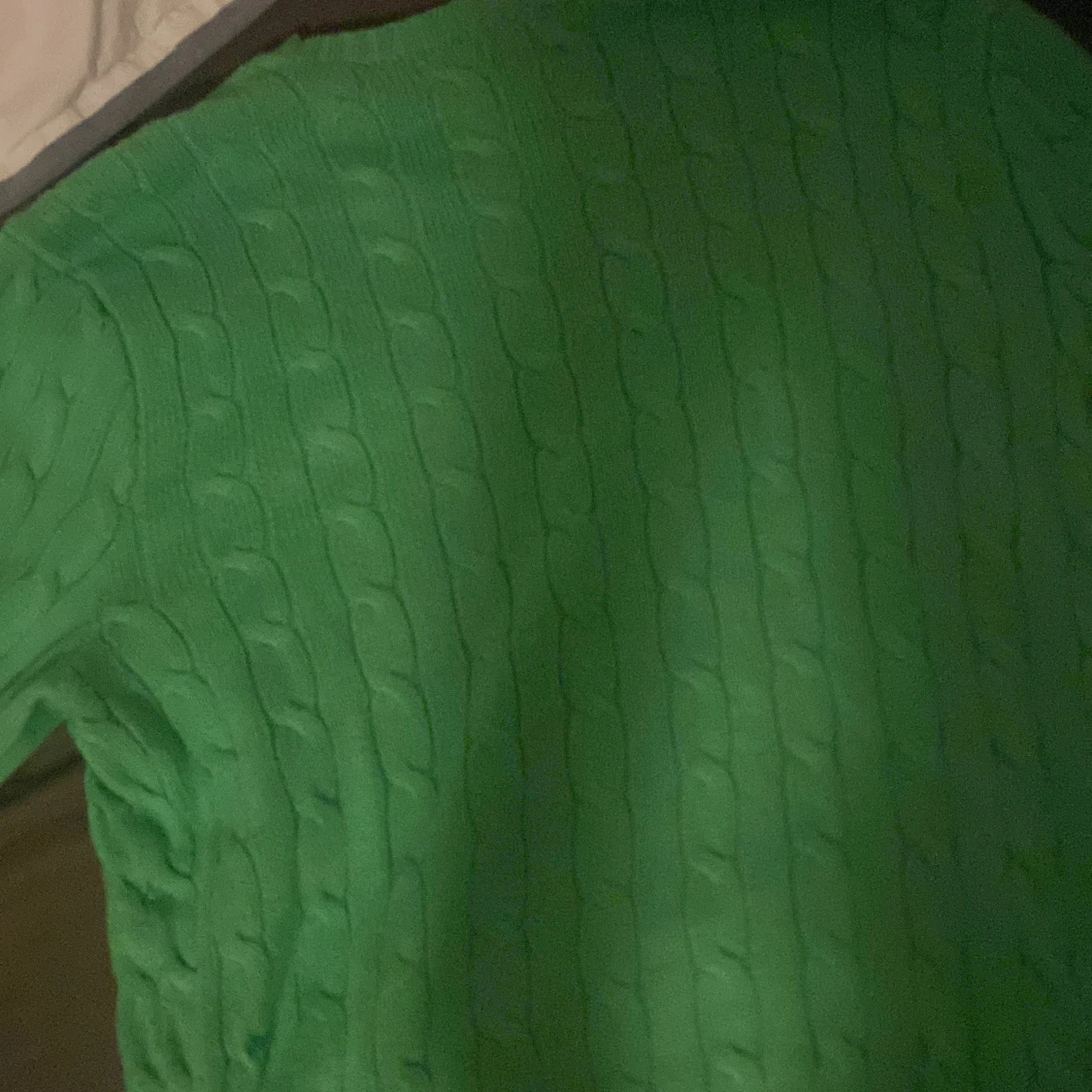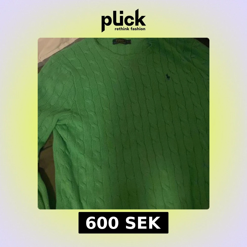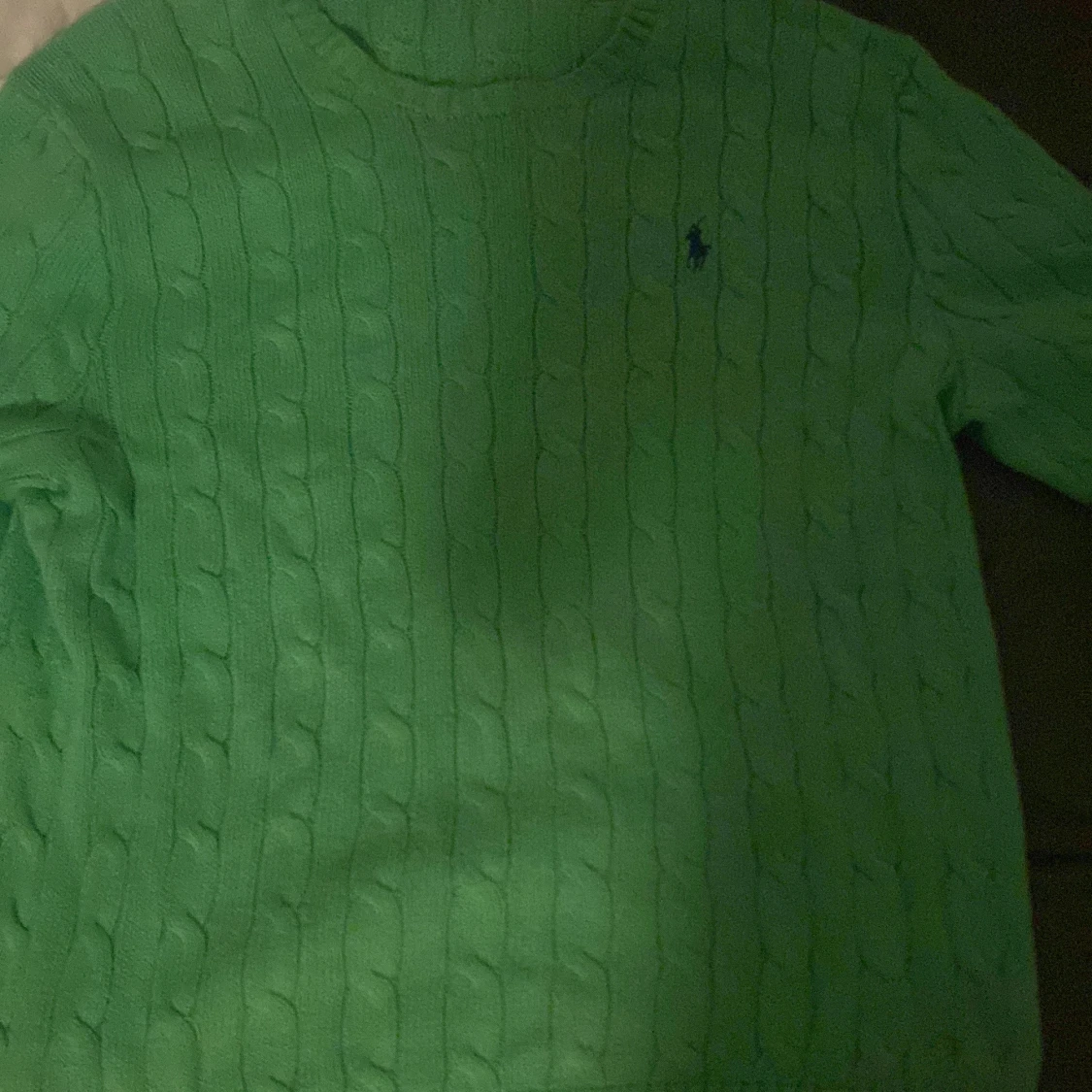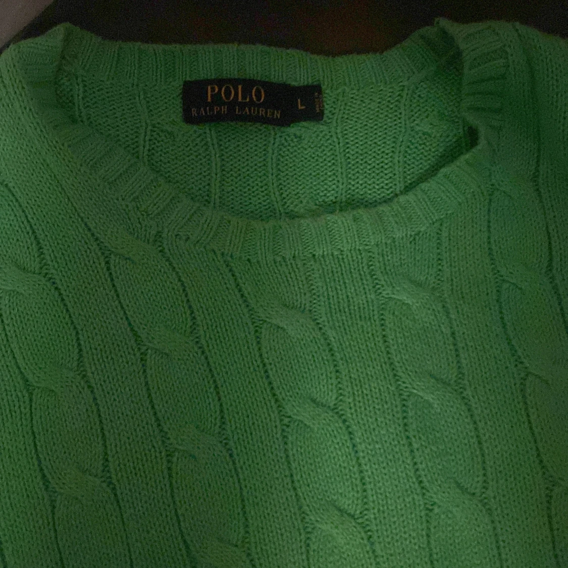 Säljer en snygg grön stickad tröja st L från Ralph Lauren med kabelstickat mönster. Tröjan har långa ärmar och en klassisk rund halsringning. Perfekt för en stilren look.