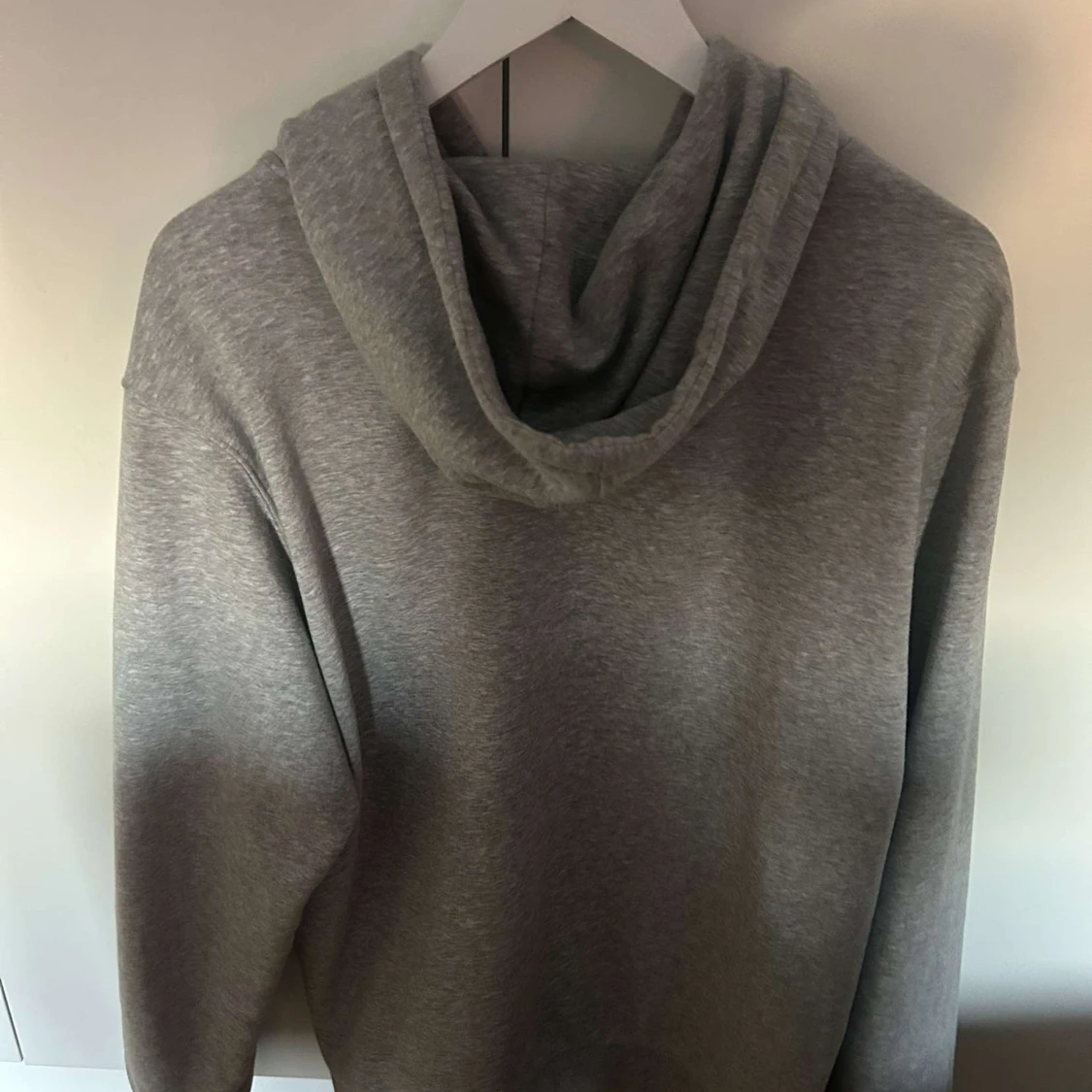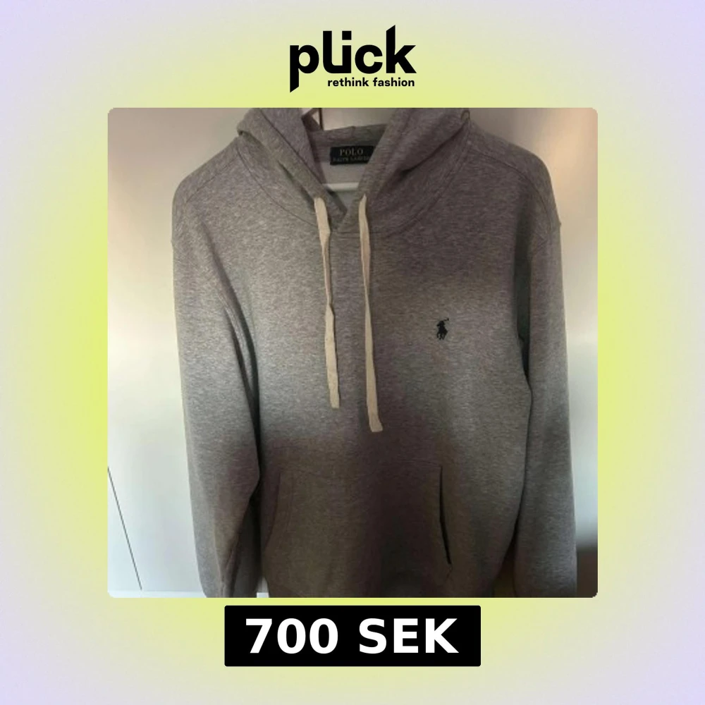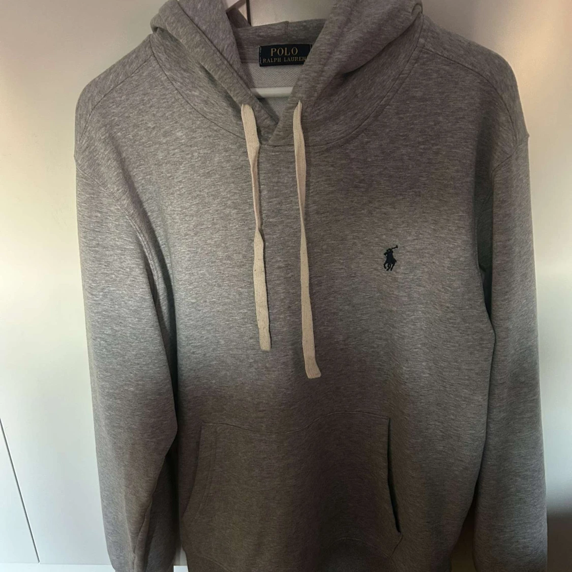 Säljer en stilren grå hoodie från Polo Ralph Lauren med klassisk logga på bröstet. Tröjan har en justerbar huva med vita snören och en praktisk magficka. Perfekt för en avslappnad look.