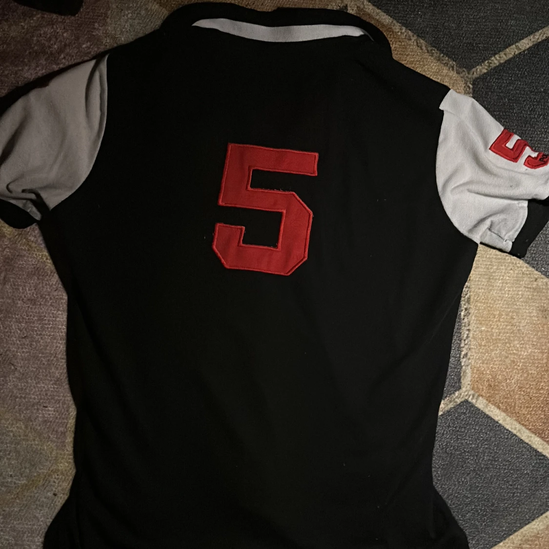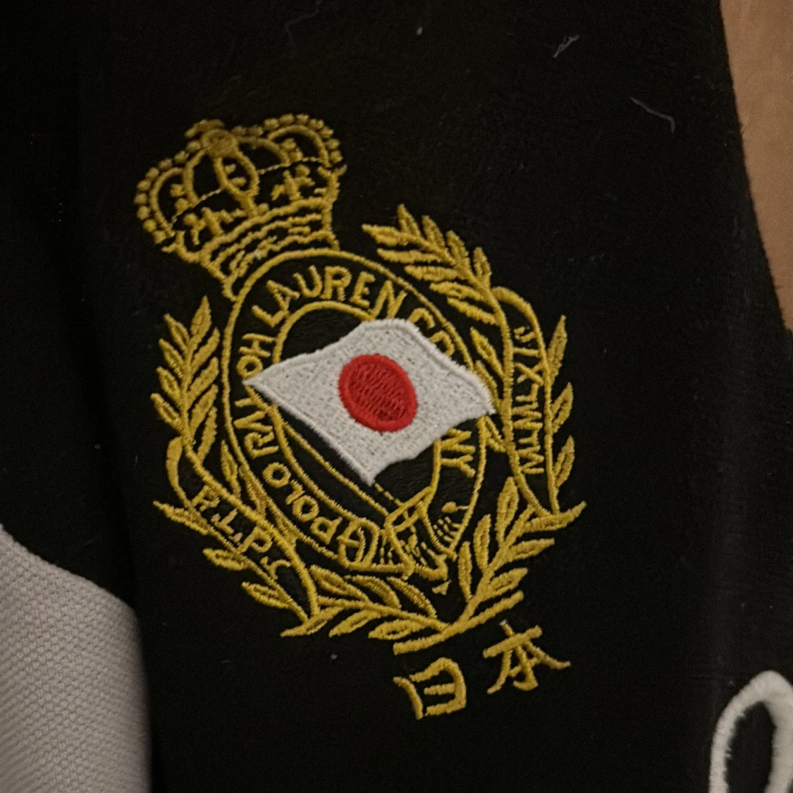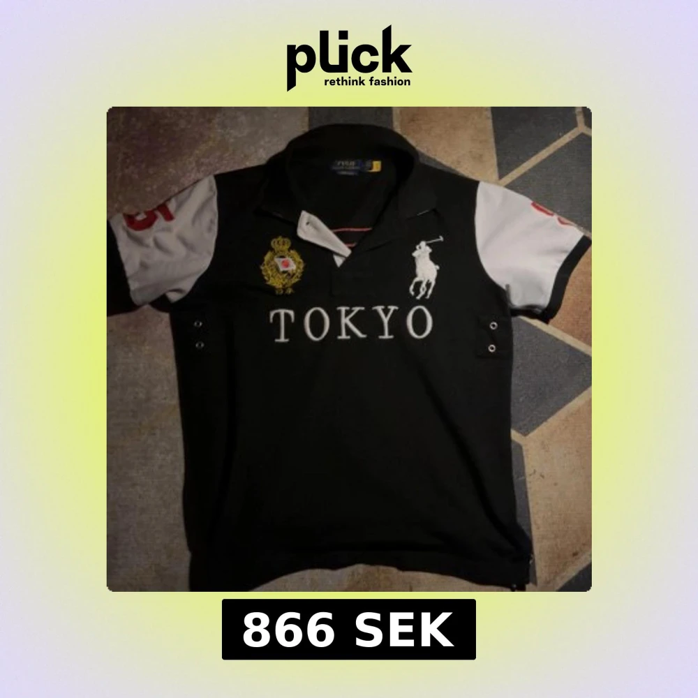Snygg svart pikétröja från Polo Ralph Lauren med vita ärmar, stora röda siffror på ärm och rygg, samt broderad Tokyo-text och emblem framtill. Klassisk polokrage och slim fit. Storleken är L men den passar M