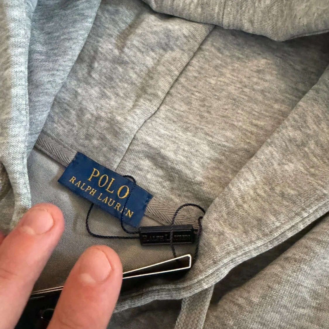 Snygg grå hoodie från Polo Ralph Lauren med dragkedja och klassisk logga broderad på bröstet. Tröjan har huva med snörning och ribbade muddar. Perfekt för en chill och stilren look.