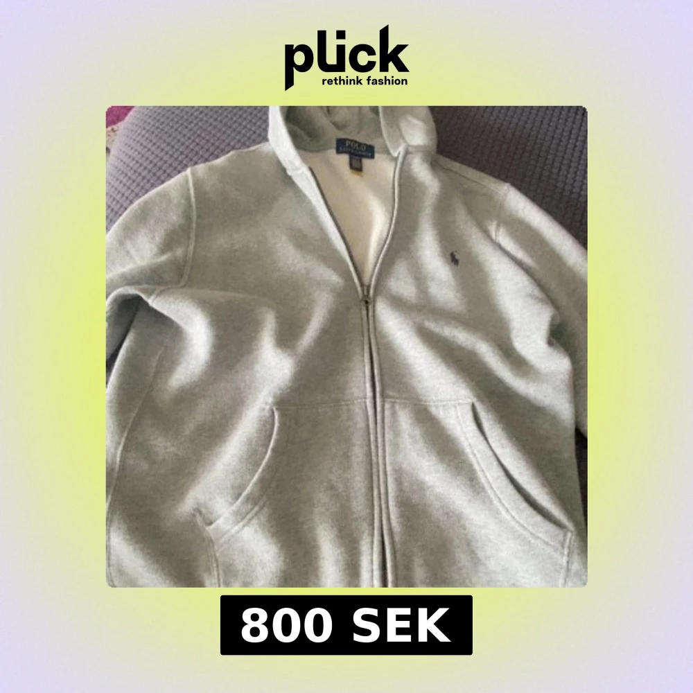 Säljer en klassisk grå hoodie från Ralph Lauren med dragkedja och fickor framtill. Perfekt för en avslappnad stil. Den har en liten logga på bröstet och är tillverkad i ett mjukt material.