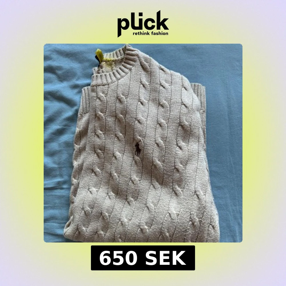 Säljer en klassisk beige stickad tröja från Ralph Lauren med kabelstickat mönster och broderad logotyp på bröstet. Tröjan har långa ärmar och en rund halsringning. Perfekt för en stilren look!
