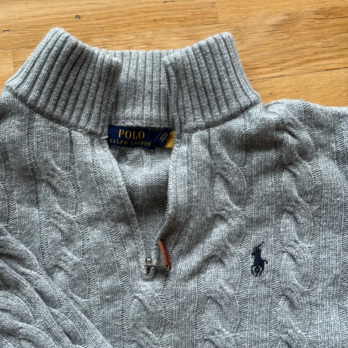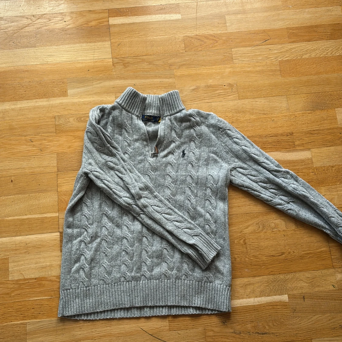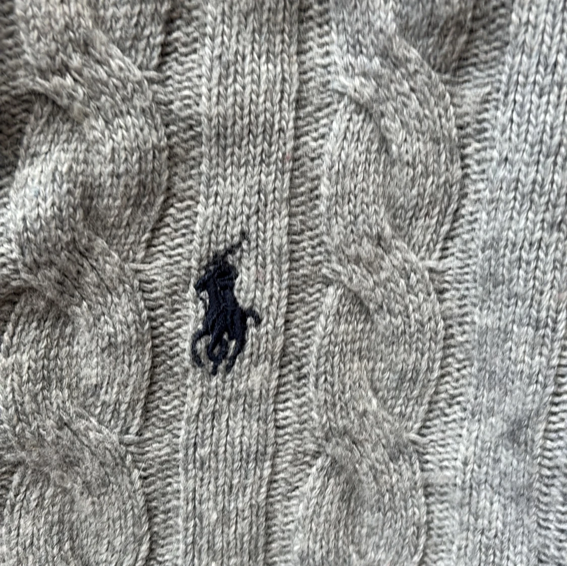 Kabelstickad grå tröja från Polo Ralph Lauren med halv dragkedja och hög krage. Klassisk broderad logga på bröstet och ribbade muddar. Perfekt för lager-på-lager och chill höst- eller vinterstil.