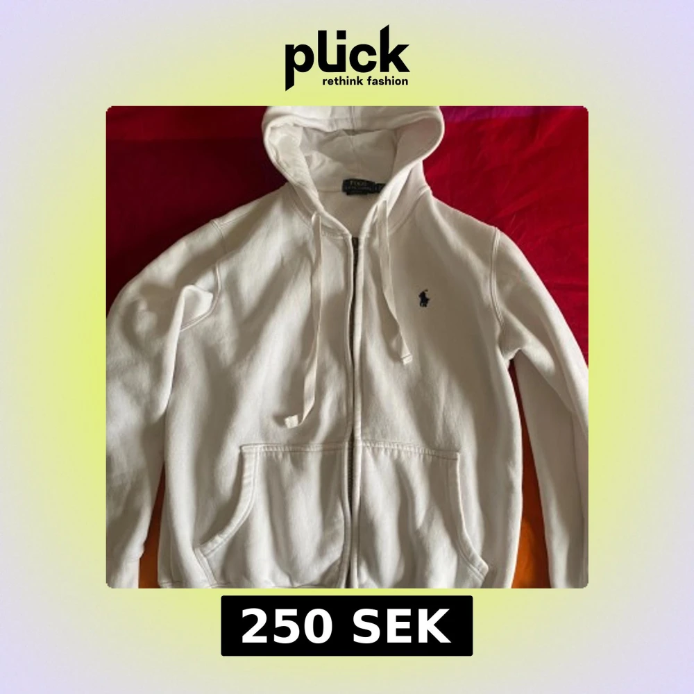 Säljer en stilren vit hoodie från Ralph Lauren med dragkedja och justerbar huva. Den har två praktiska fickor framtill och en liten broderad logga på bröstet. Perfekt för en avslappnad look.