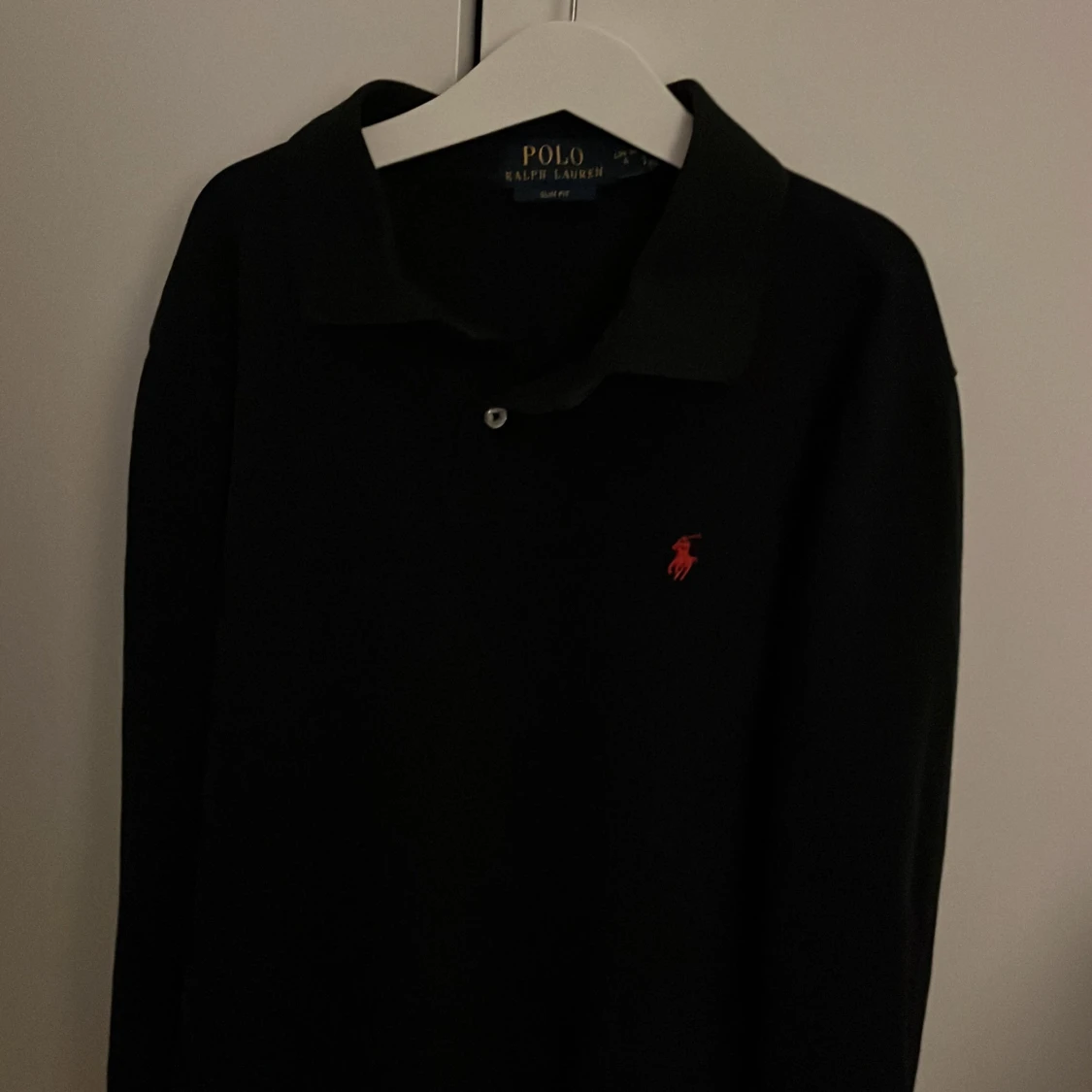 Säljer en stilren svart långärmad pikétröja från Ralph Lauren i slim fit. Tröjan har en klassisk krage och en liten röd broderad logga på bröstet. Perfekt för både vardag och fest! Pris går att diskutera skick är 10/10