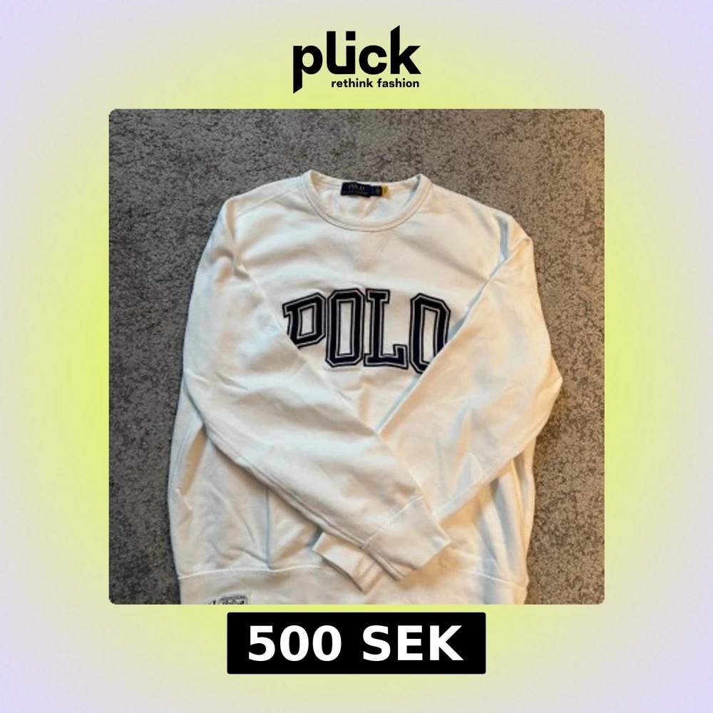 Säljer en stilren vit sweatshirt från Polo Ralph Lauren med svart text på framsidan. Storlek L men sitter även bra för storlek M. Hör av dig om du är intresserad!