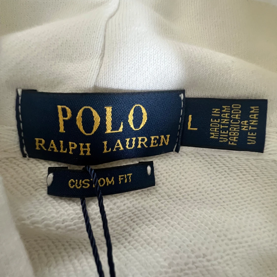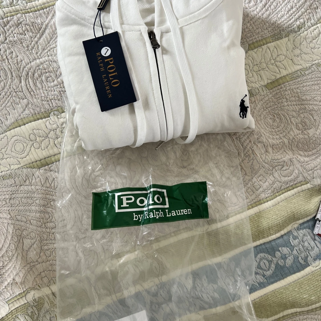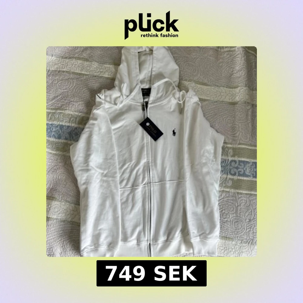 Snygg vit hoodie från Polo Ralph Lauren med dragkedja och huva. Klassisk broderad logga på bröstet och ribbade muddar. Den är endast testats men är för stor för mig… alltså helt ny. Påse och etiket får med. Obs (k@pia)