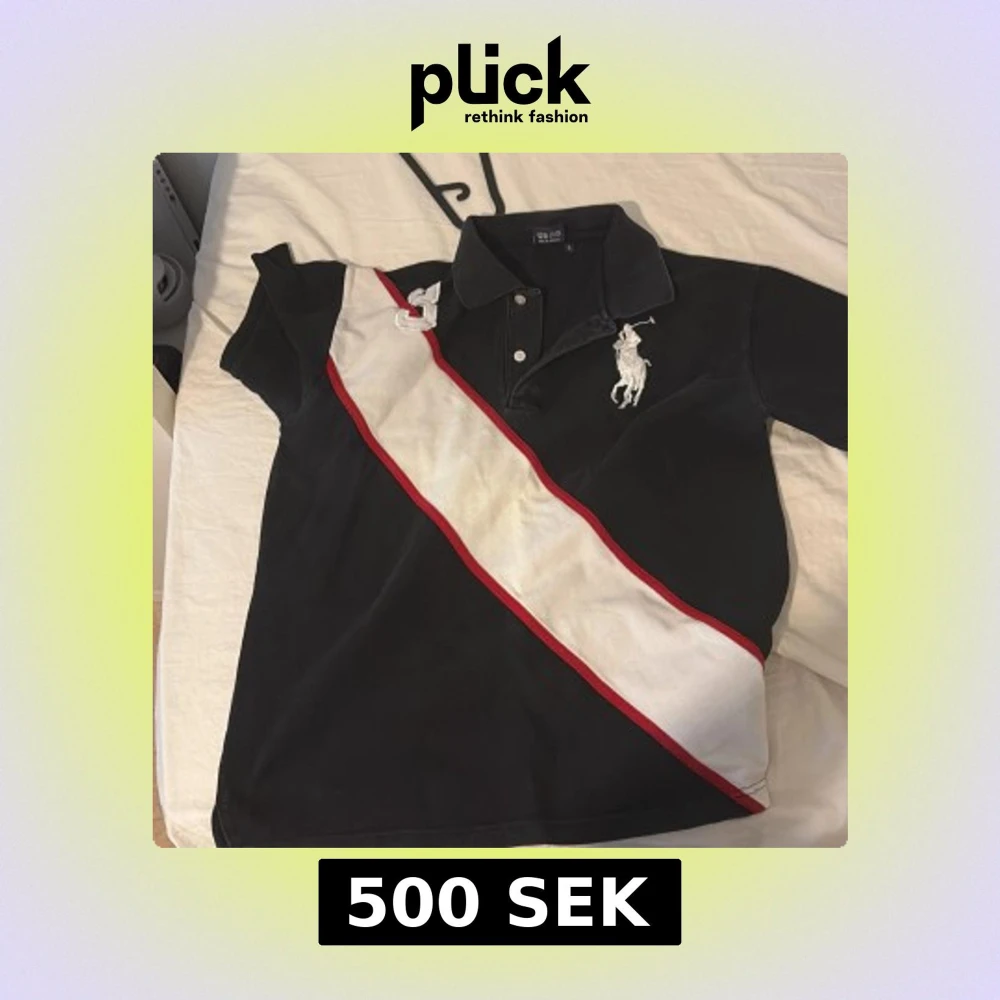 Säljer en svart pikétröja från Ralph Lauren med en stor vit och röd diagonal rand. Tröjan har korta ärmar och en klassisk krage med knappar. Den ikoniska hästloggan är broderad på bröstet. Perfekt för en stilren look.