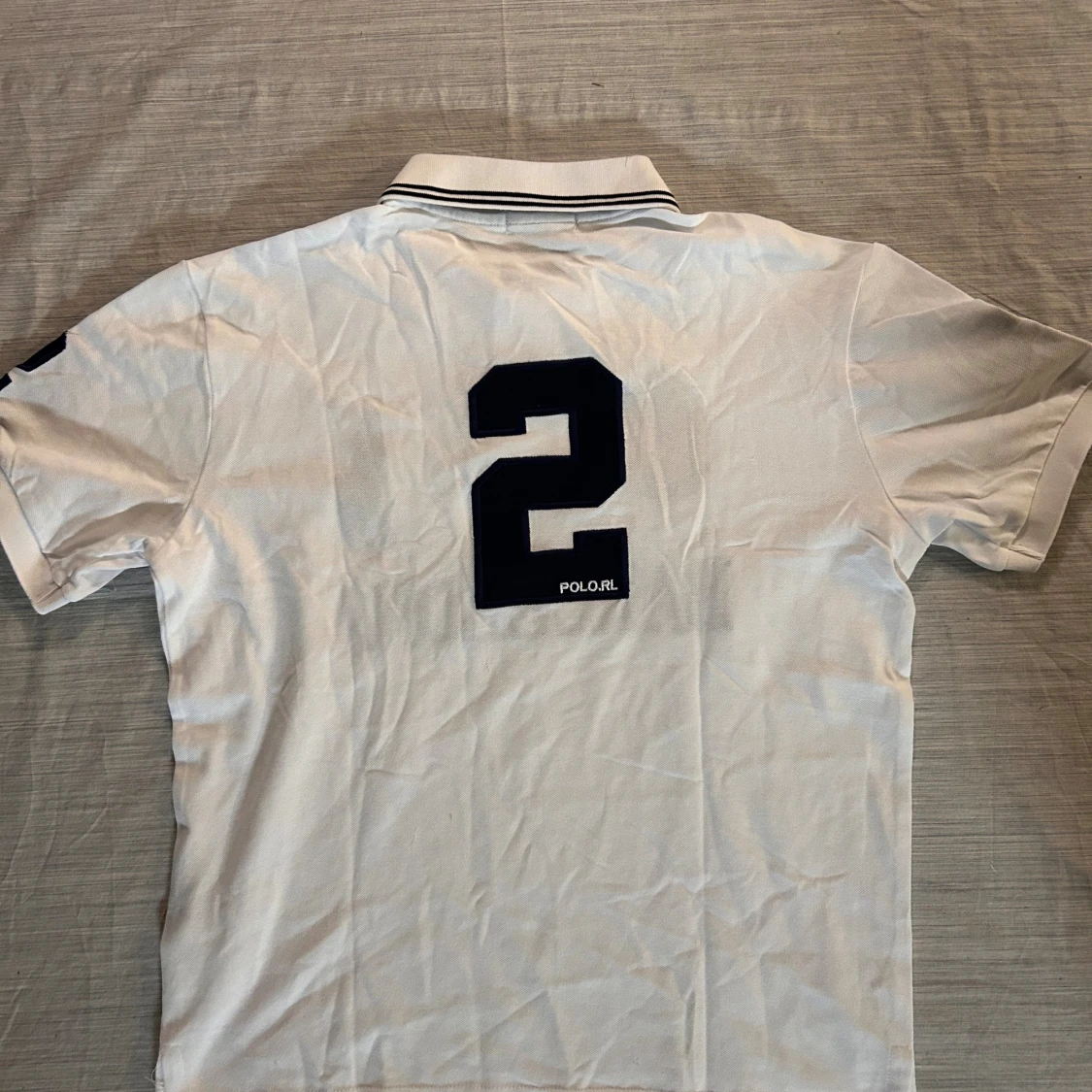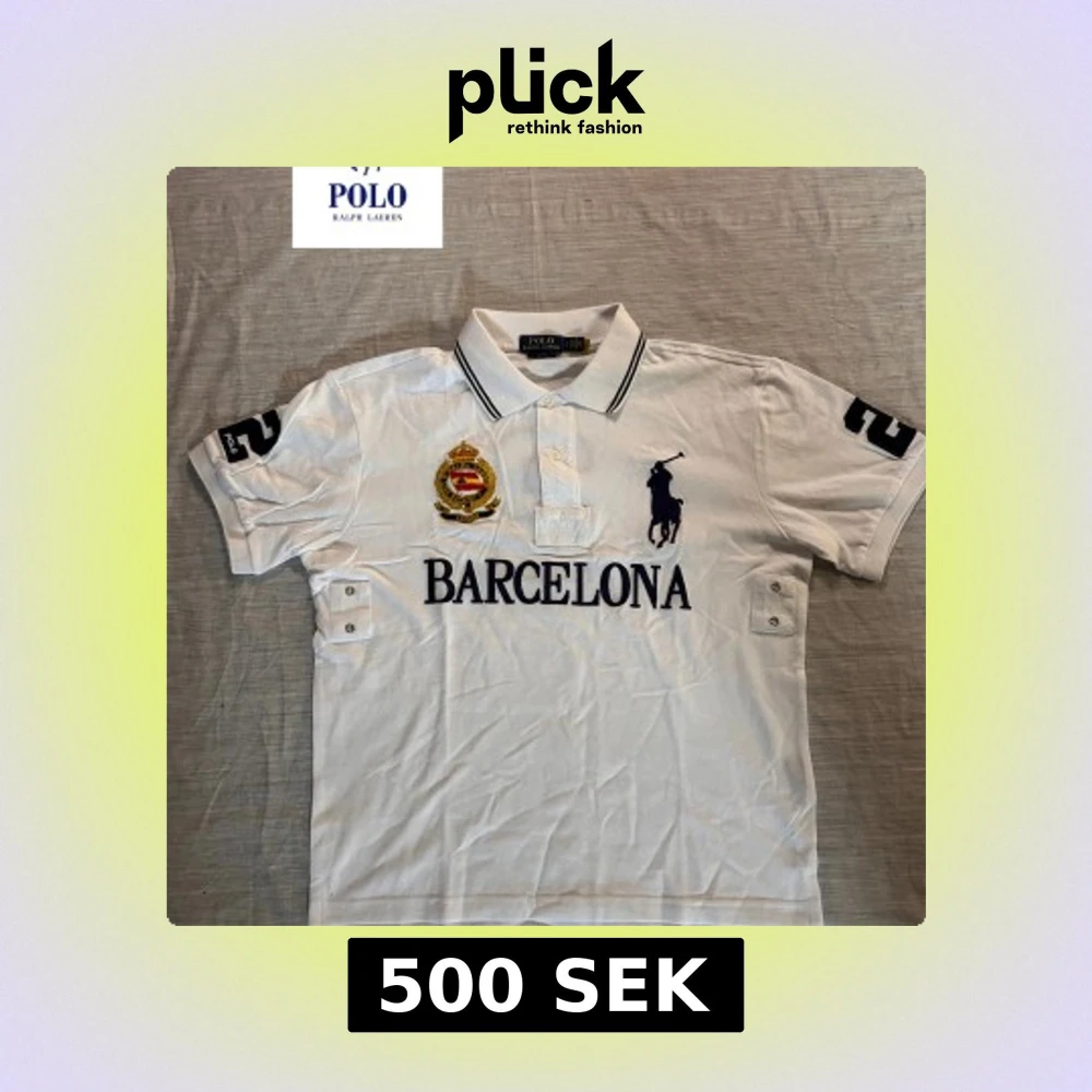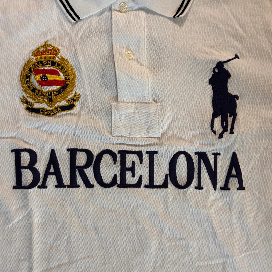 Vit pikétröja från Polo Ralph Lauren i slim fit med broderad logga, emblem och texten BARCELONA på bröstet. Tröjan har klassisk krage med knappar, svarta detaljer på kragen och ärmarna samt stora siffror på ärmarna. Perfekt för dig som gillar sportig och stilren look.