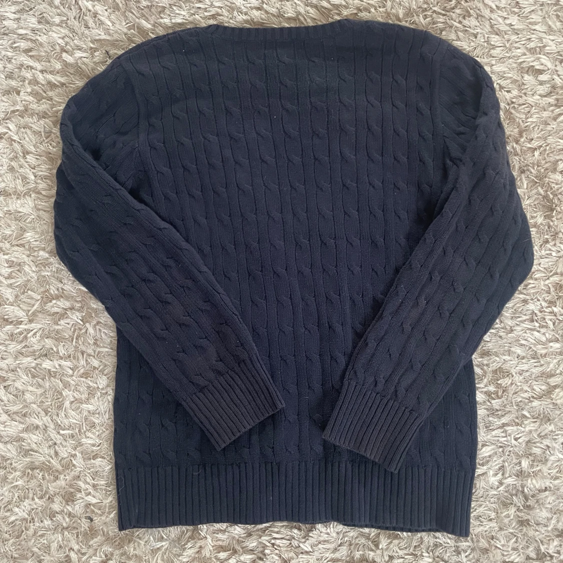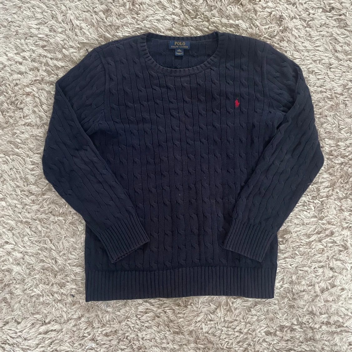 Kabelstickad mörkblå tröja från Polo Ralph Lauren med klassisk rund halsringning och röd broderad logga på bröstet. Tröjan har långa ärmar och breda ribbade muddar vid ärmslut och nederkant. Perfekt för en stilren och chill look.