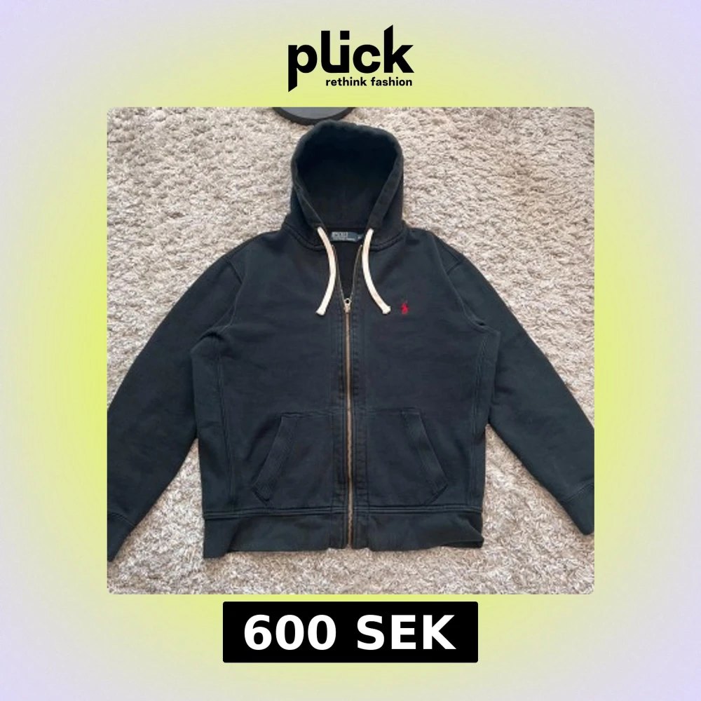 Svart hoodie från Polo Ralph Lauren med dragkedja och huva. Tröjan har vita snören, två fickor fram och en liten röd broderad logga på bröstet. Perfekt för en avslappnad stil. Storlek på etiketten är XL men passar bättre L eller M. Se mått. Armhåla-armhåla: ca 60cm. Längd från axel: ca 62cm.