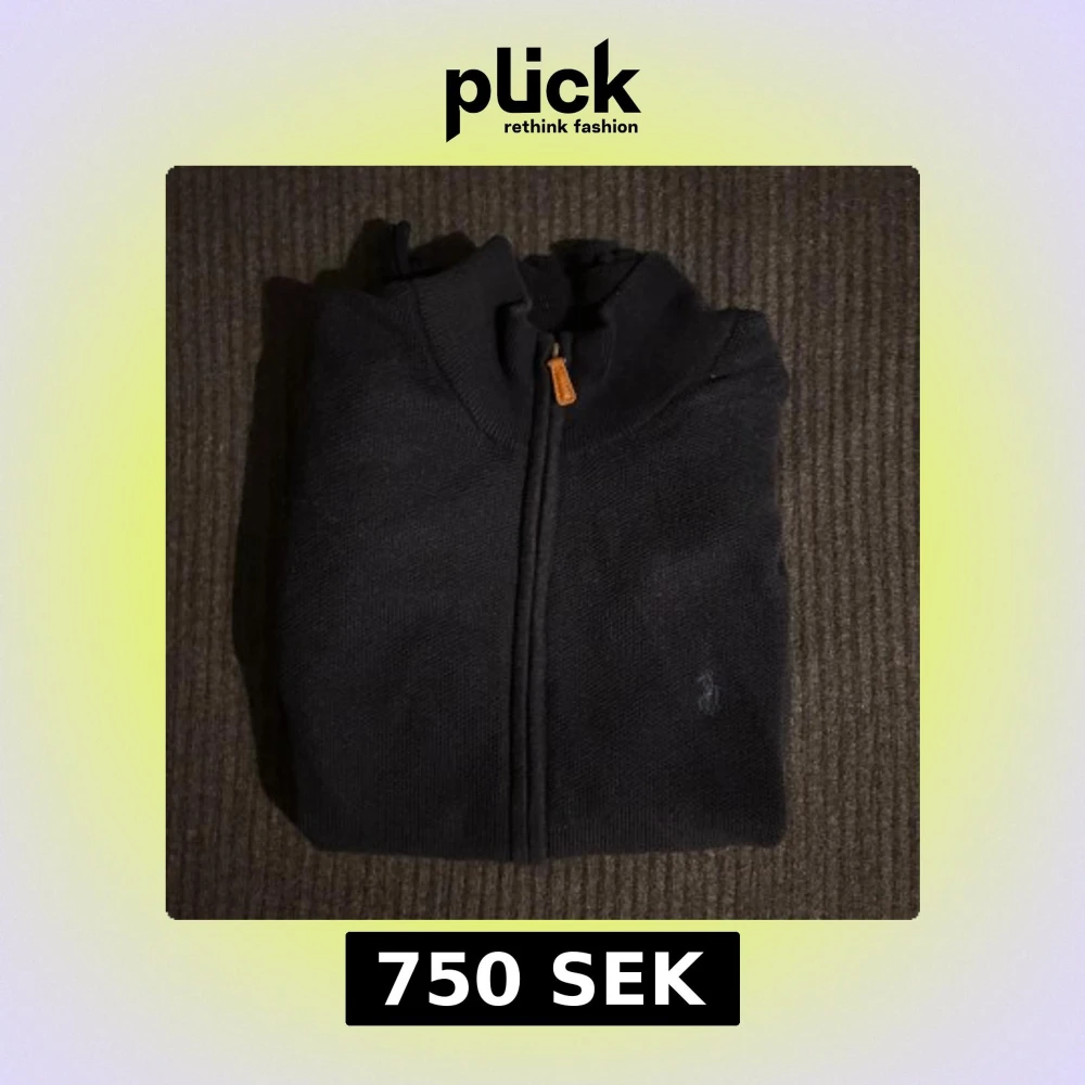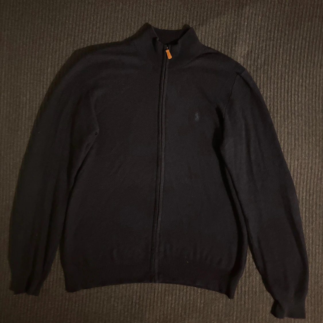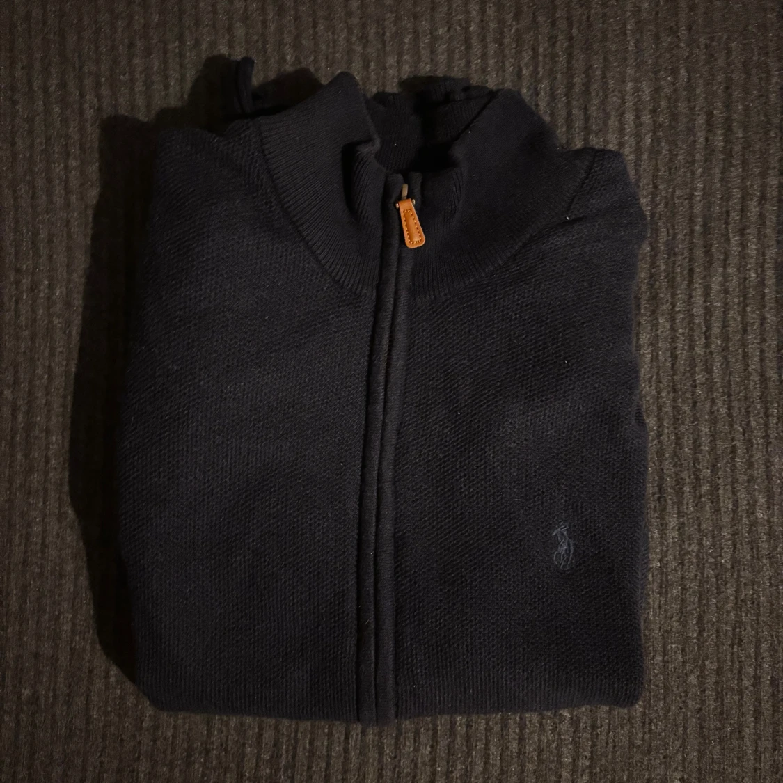Mörkblå kofta från Ralph Lauren med hel dragkedja och diskret broderad logga på bröstet. Tröjan har ribbade muddar och hög krage, perfekt för lager-på-lager. Klassisk och stilren design som funkar till det mesta.