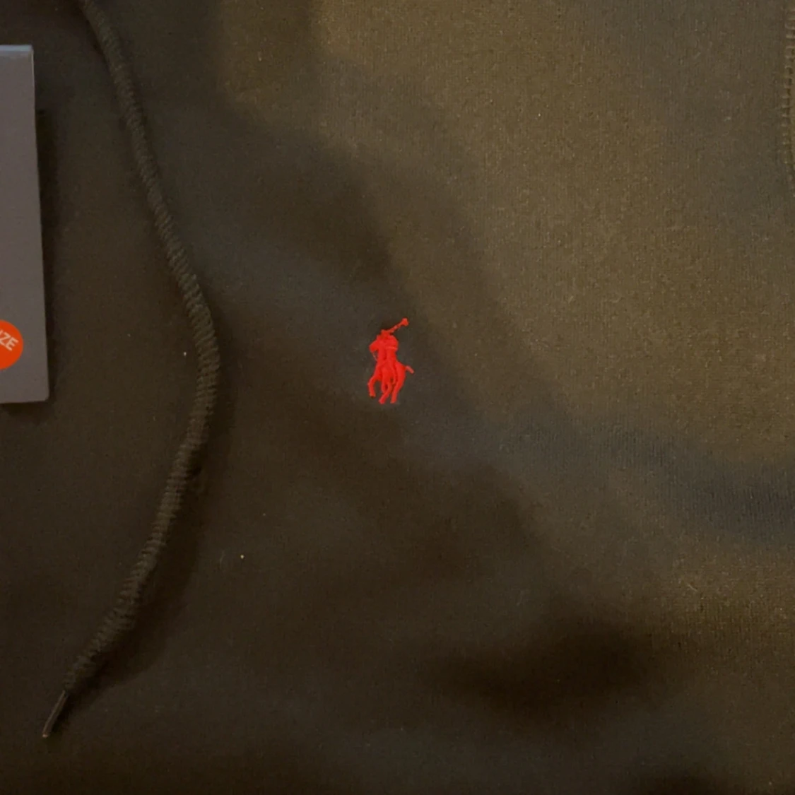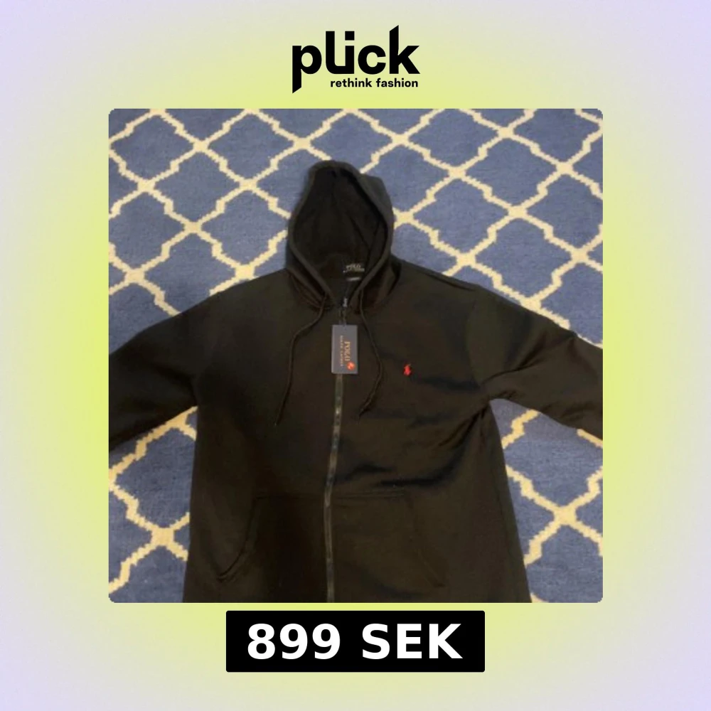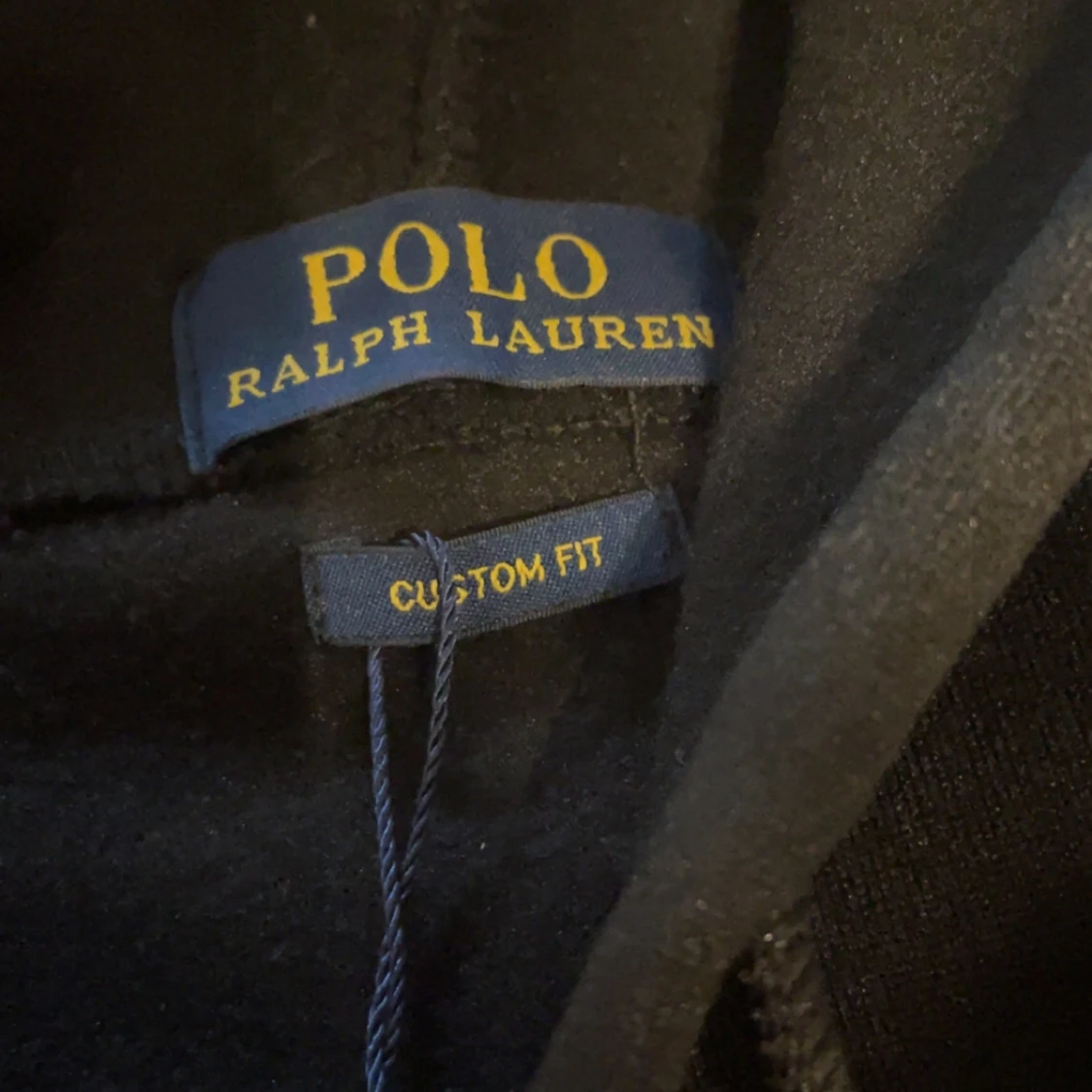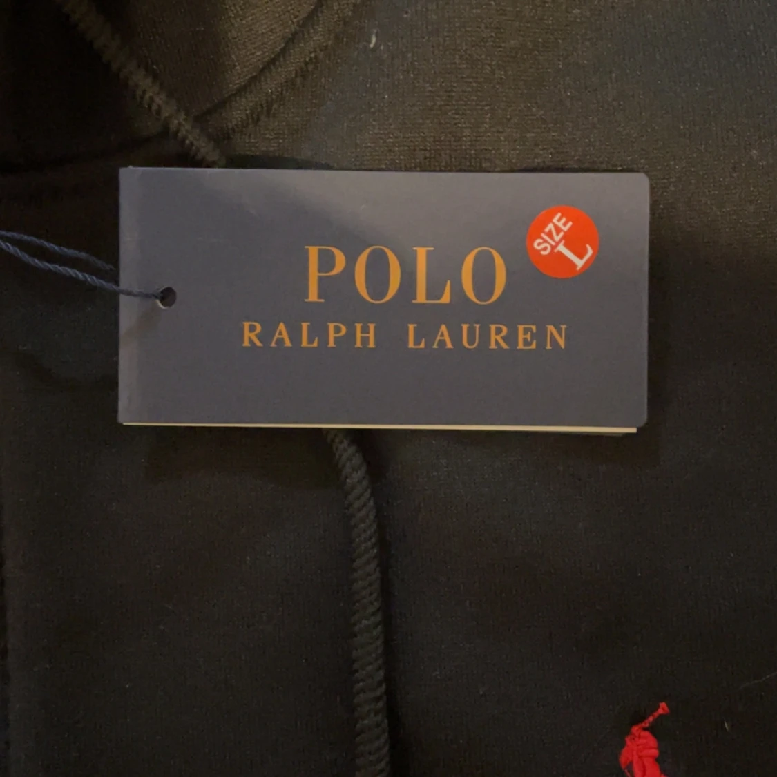 Svart hoodie från Polo Ralph Lauren i storlek L. Klassisk design med huva, dragkedja och känguruficka. Broderad röd logga på bröstet och snörning i huvan. Custom fit-modell i mjukt bomullsmaterial, perfekt för chill dagar.
