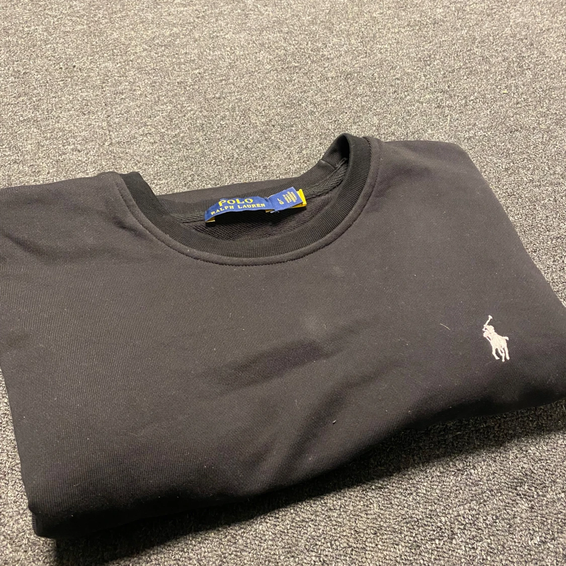 Säljer en stilren svart tröja från Polo Ralph Lauren med deras ikoniska logga broderad i vitt på bröstet. Tröjan har långa ärmar och en klassisk rund halsringning. Perfekt för en avslappnad och snygg look.