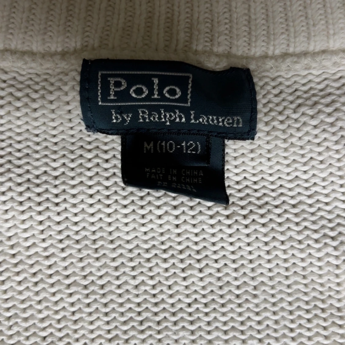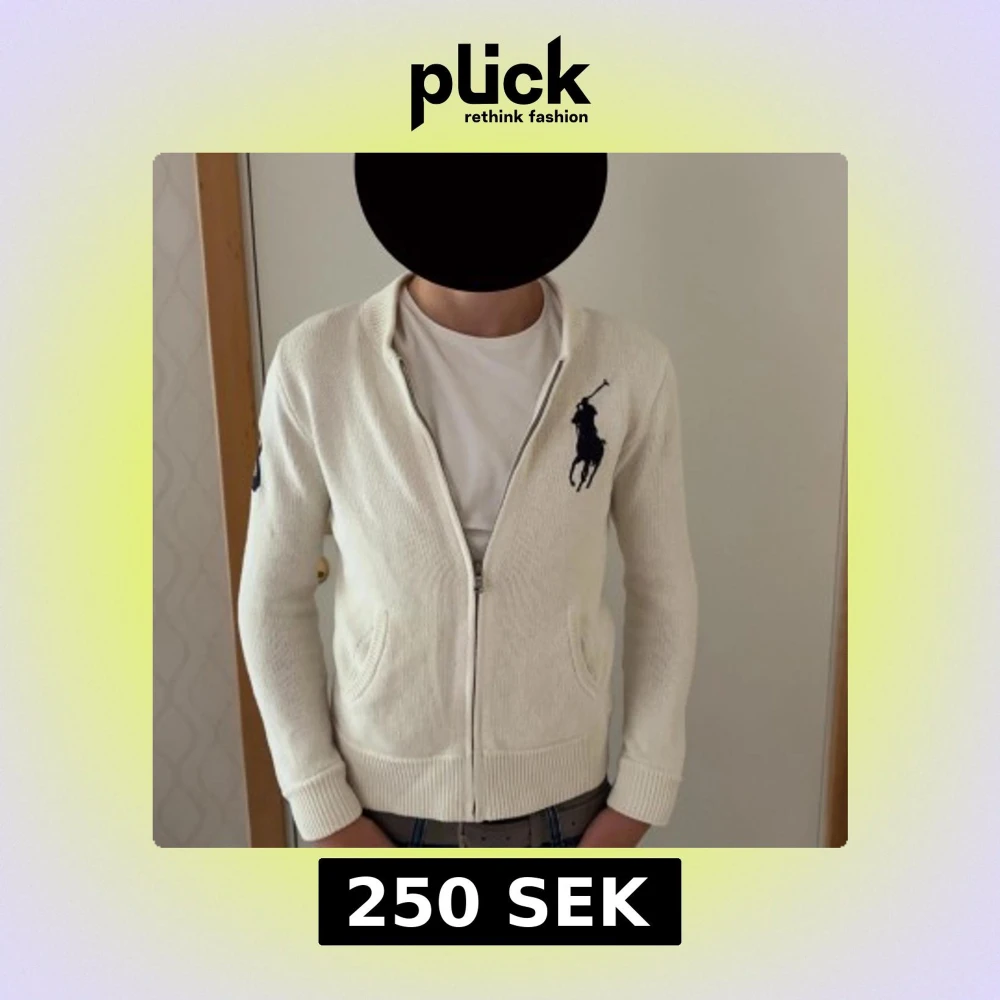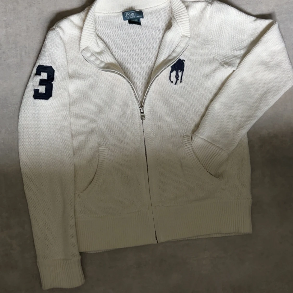 Vit stickad kofta från Polo Ralph Lauren med dragkedja, ribbade muddar och två fickor fram. Stor broderad marinblå logga på bröstet och siffra 3 på ärmen. Perfekt för en clean och klassisk stil.