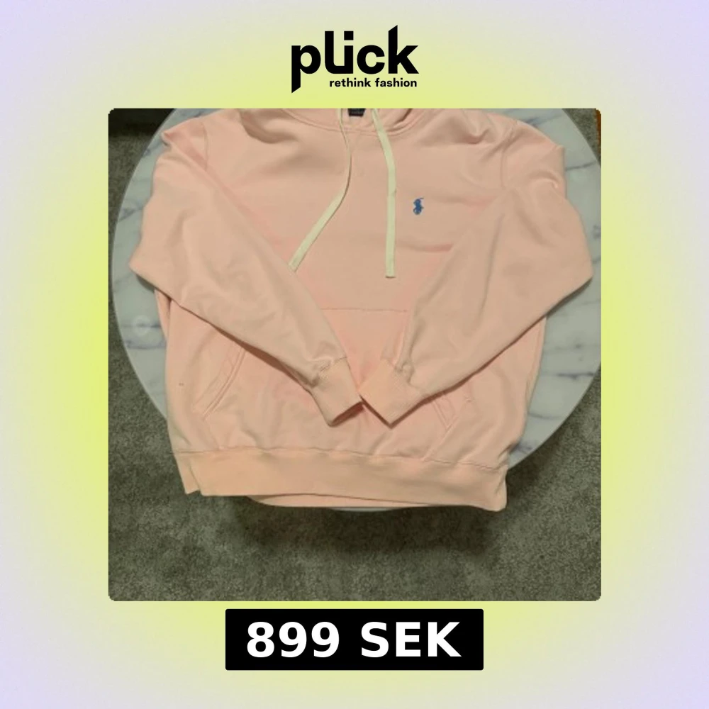 Säljer en ljusrosa hoodie från Polo Ralph Lauren med klassisk blå logga på bröstet. Tröjan har huva med vita snören, känguruficka och ribbade muddar. Perfekt för dig som gillar en clean och stilren look.