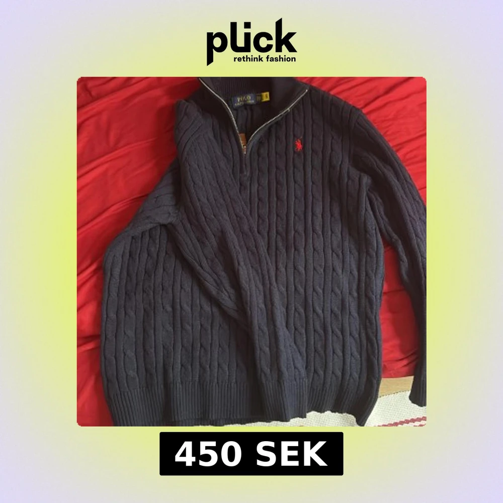 Säljer en mörkblå stickad tröja från Polo Ralph Lauren med halv dragkedja och klassiskt kabelstickat mönster. Tröjan har lång ärm, hög krage och röd broderad logga på bröstet. Perfekt för en stilren och avslappnad look.