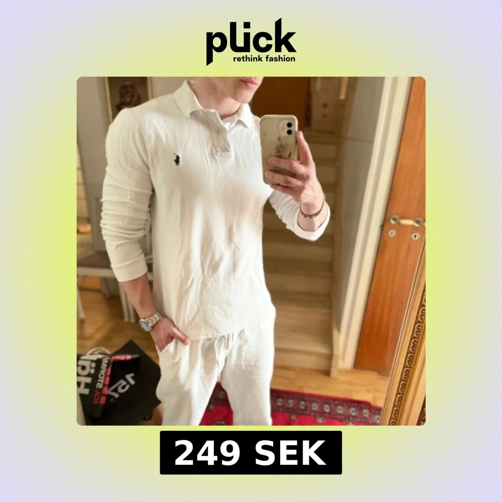 Säljer en klassisk vit långärmad pikétröja från Polo Ralph Lauren. Tröjan har krage, knappar vid halsen och den ikoniska broderade loggan på bröstet. Slim fit-modell som sitter snyggt på kroppen.