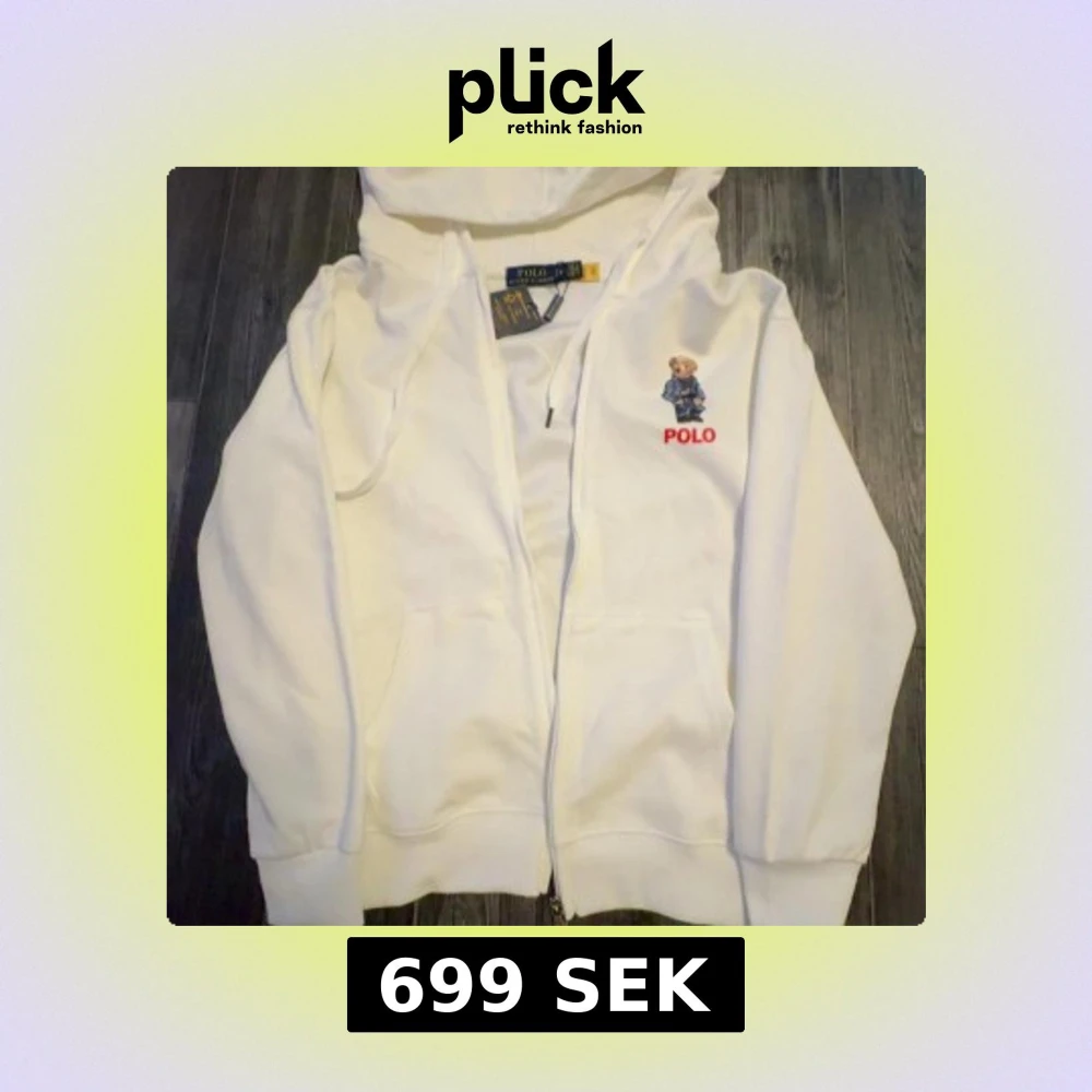 Säljer en vit hoodie från Polo Ralph Lauren i storlek M. Tröjan har dragkedja, huva med snörning och en broderad nalle på bröstet med röd POLO-text. Tillverkad i mjuk bomull, perfekt för en chill och stilren look.