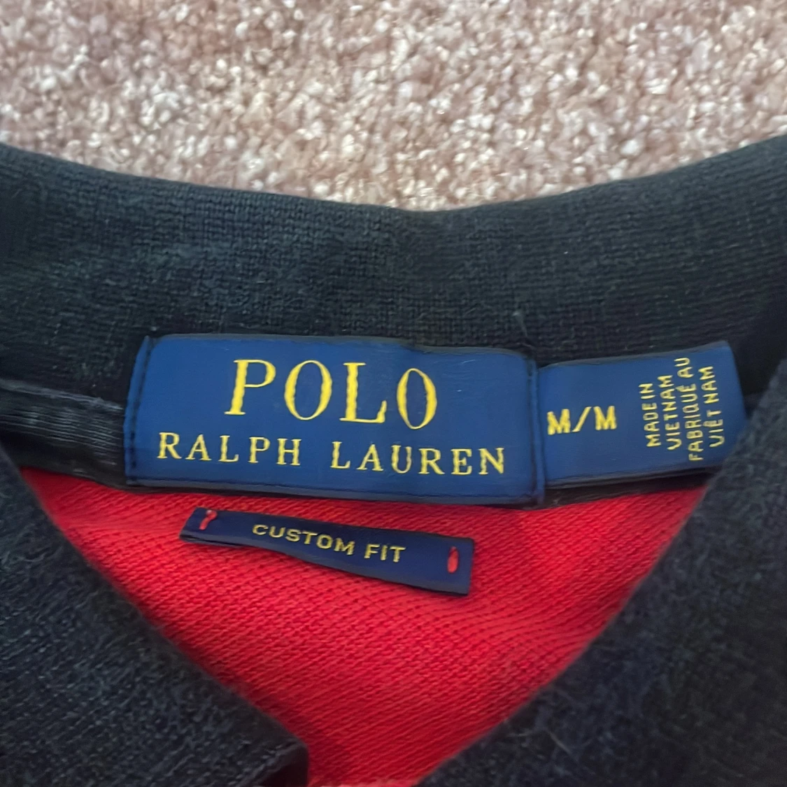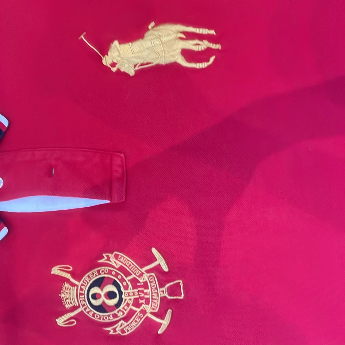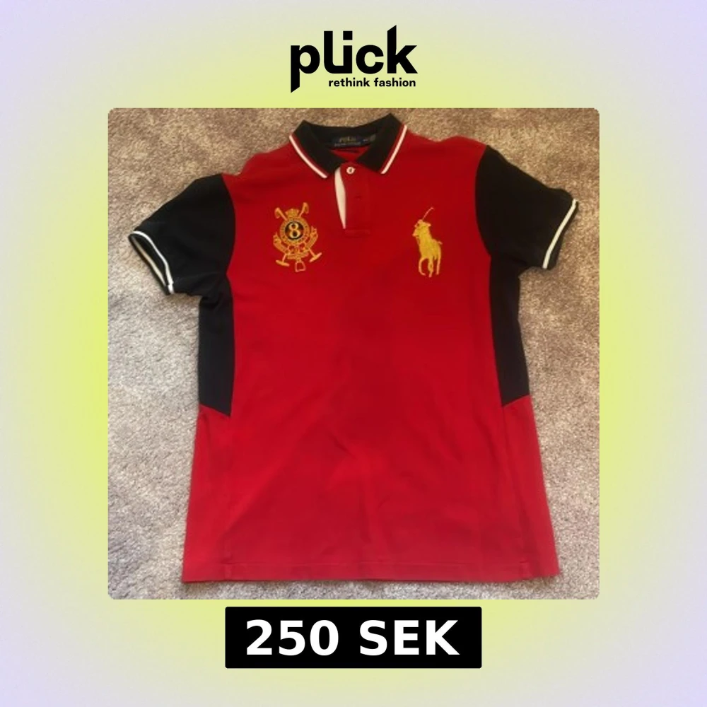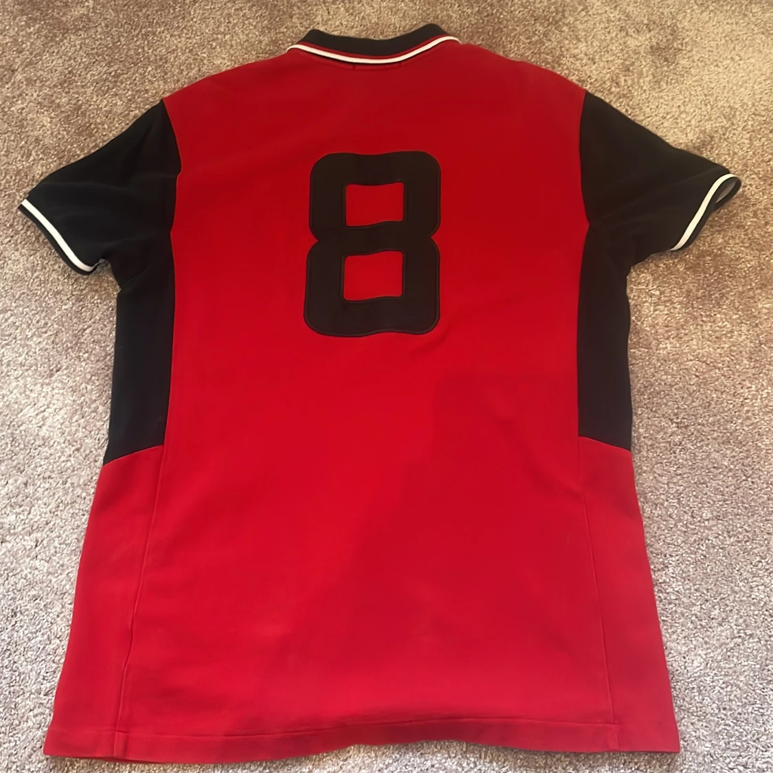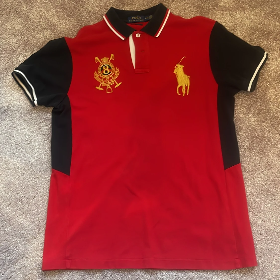 Snygg röd pikétröja från Polo Ralph Lauren med svarta detaljer på ärmar och sidor. Tröjan har broderade emblem och en stor gul Polo-logga på bröstet samt siffran 8 på ryggen. Kragen har vita och svarta ränder och modellen är custom fit.