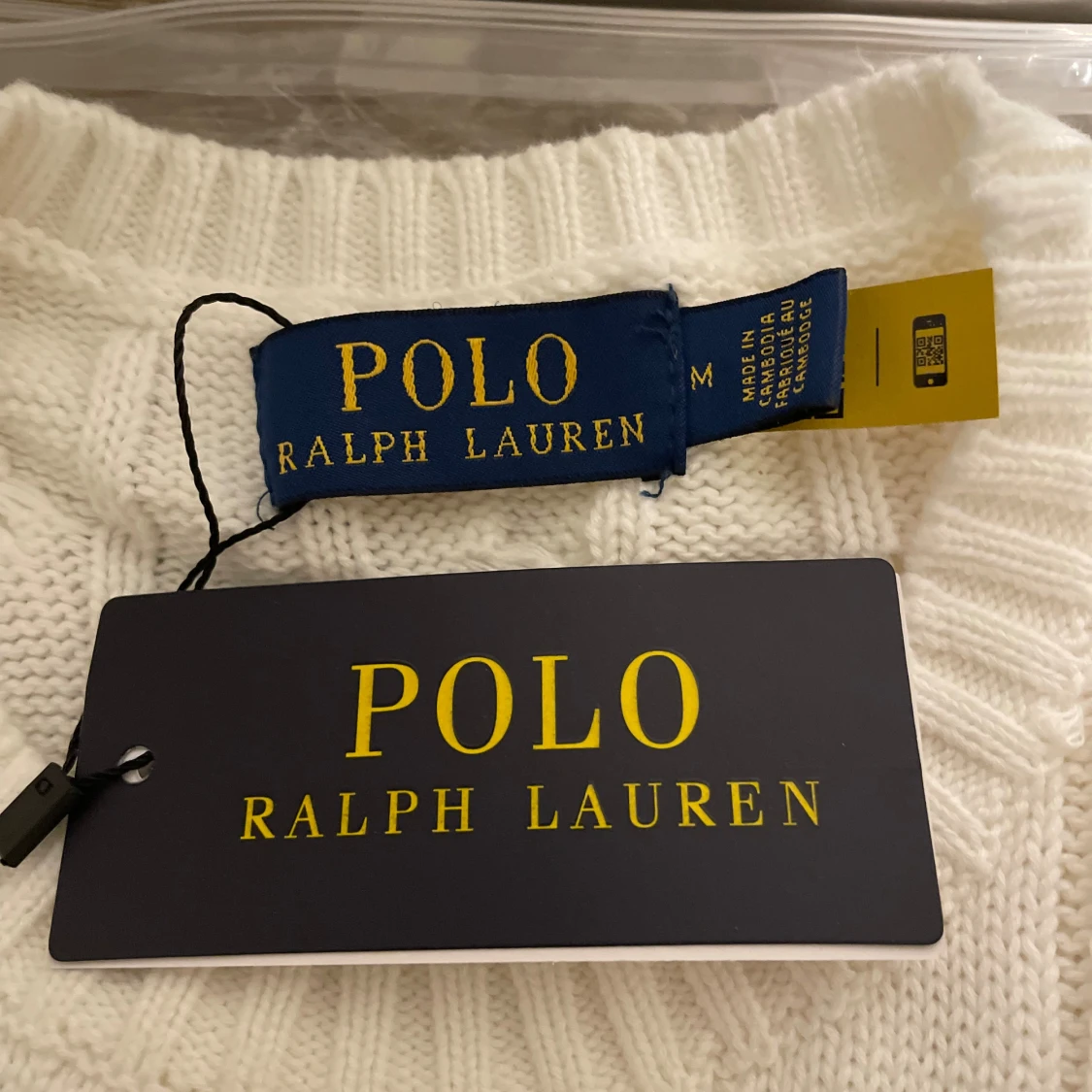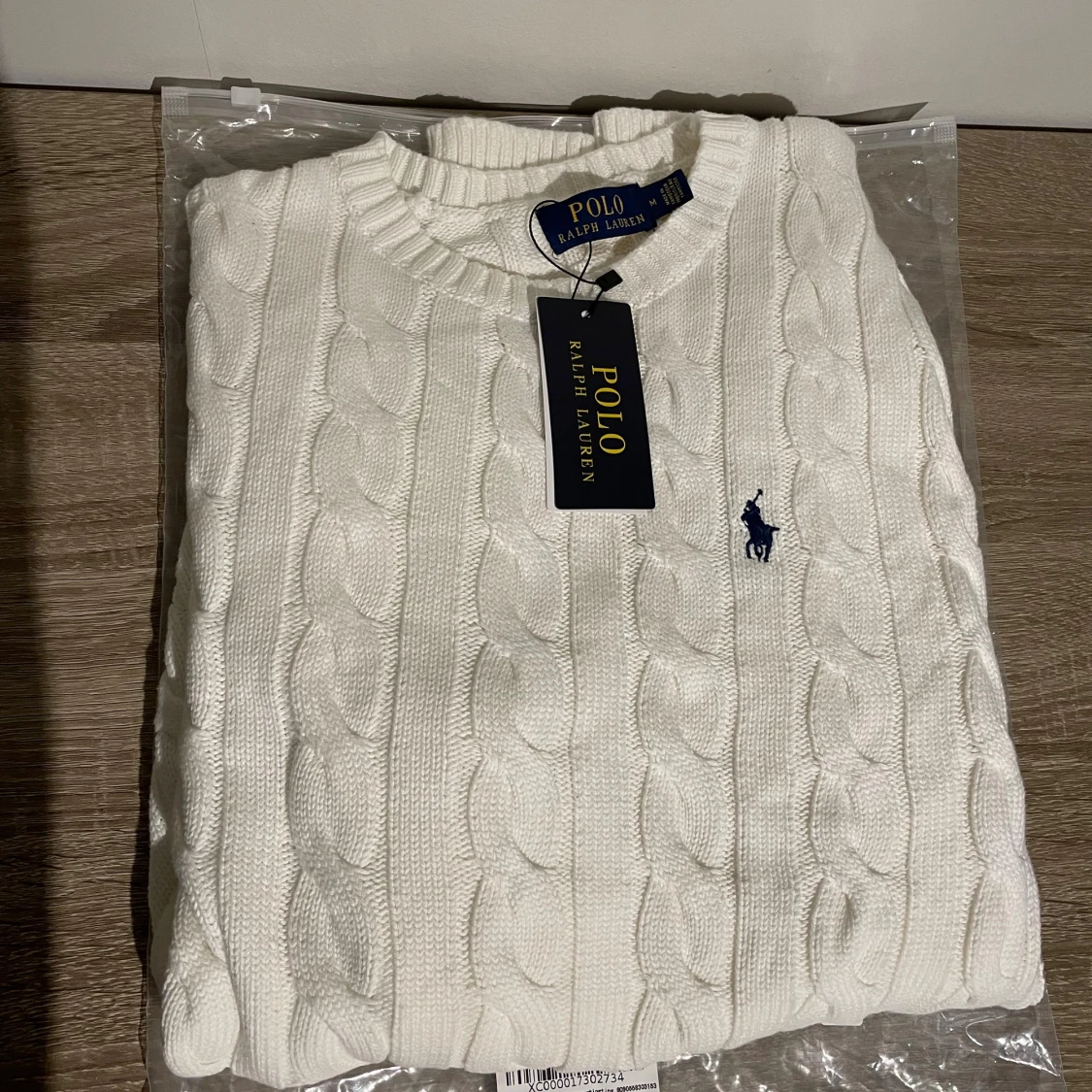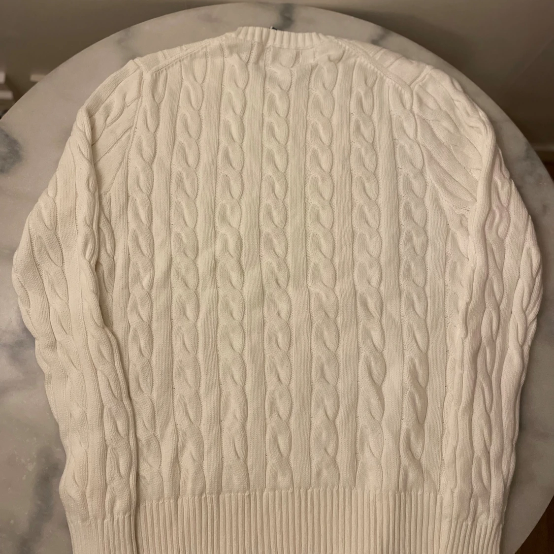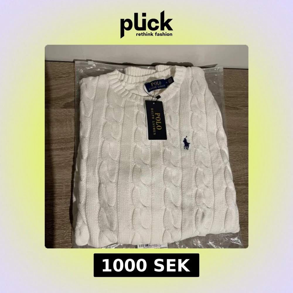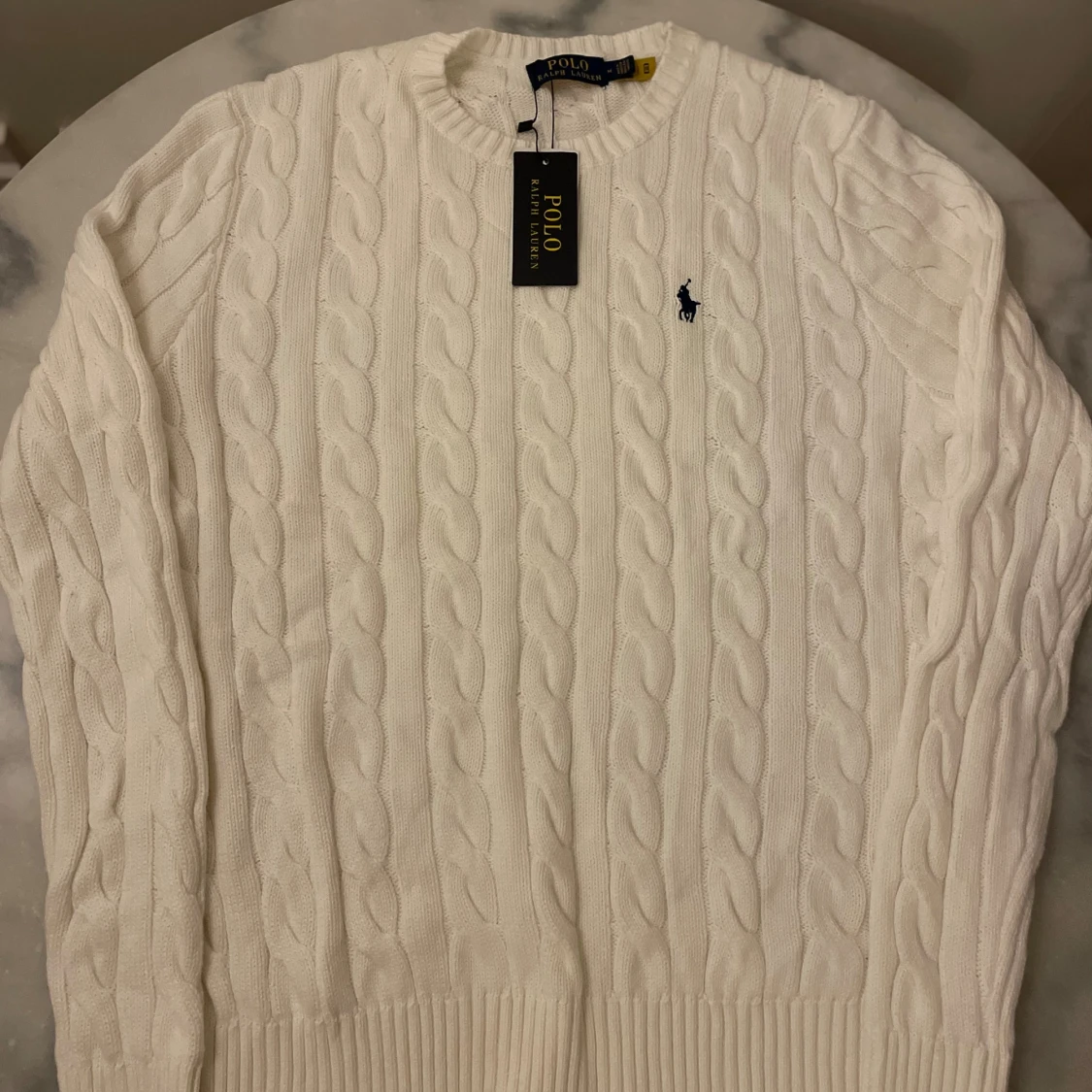 Vit kabelstickad tröja från Polo Ralph Lauren med klassisk rund halsringning och broderad marinblå logga på bröstet. Tröjan har ribbade muddar och är tillverkad i mjuk bomull. Perfekt för en clean och stilren look.