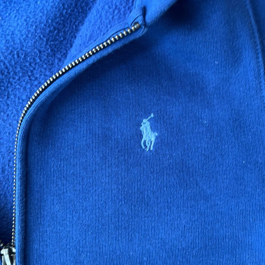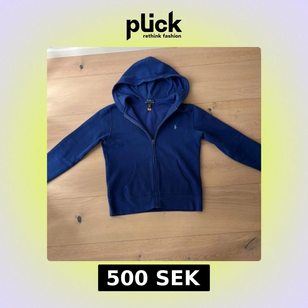 Säljer en blå hoodie från Polo Ralph Lauren med dragkedja och huva. Tröjan har två fickor framtill och klassisk broderad logga på bröstet. Perfekt för en avslappnad stil.