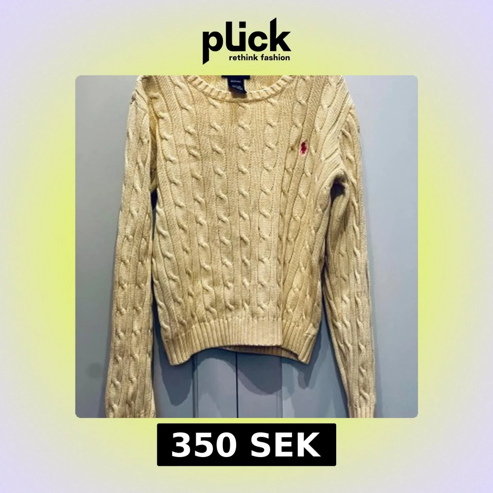 Kabelstickad ljusgul tröja från Ralph Lauren i 100% bomull. Klassisk rund halsringning och långärmad modell med den ikoniska röda broderade loggan på bröstet. Perfekt för dig som gillar preppy och tidlös stil.