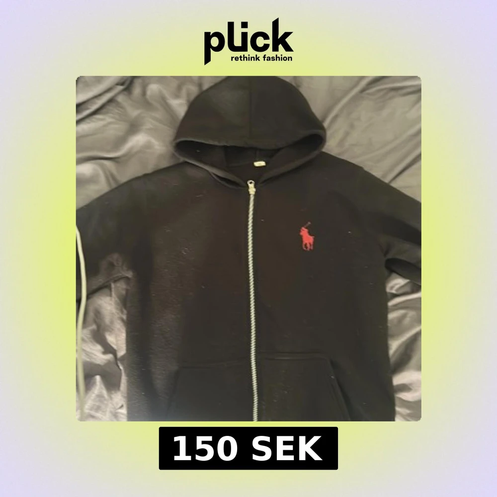 Svart hoodie från Polo Ralph Lauren i storlek M. Tröjan har dragkedja framtill, huva och en röd broderad logga på bröstet. Tillverkad i mjuk bomullsmix med fleece på insidan för extra komfort. Perfekt för chill dagar eller när du vill ha en clean streetstyle. Ja vet inte om den är äkta eller inte för de är inte min tröja.
