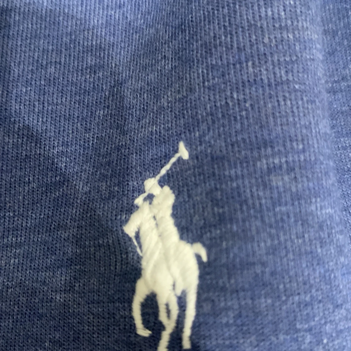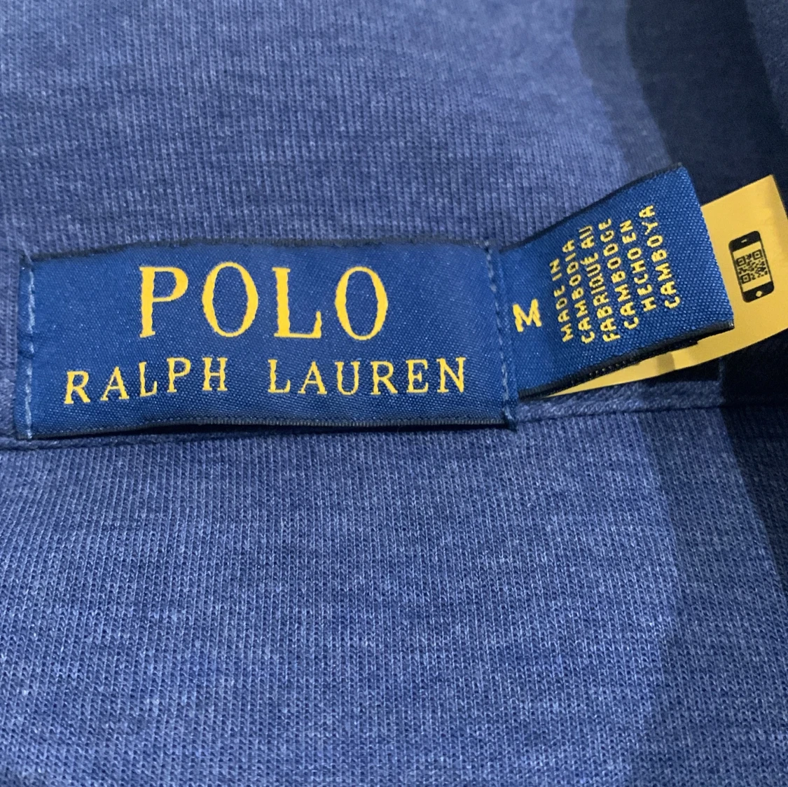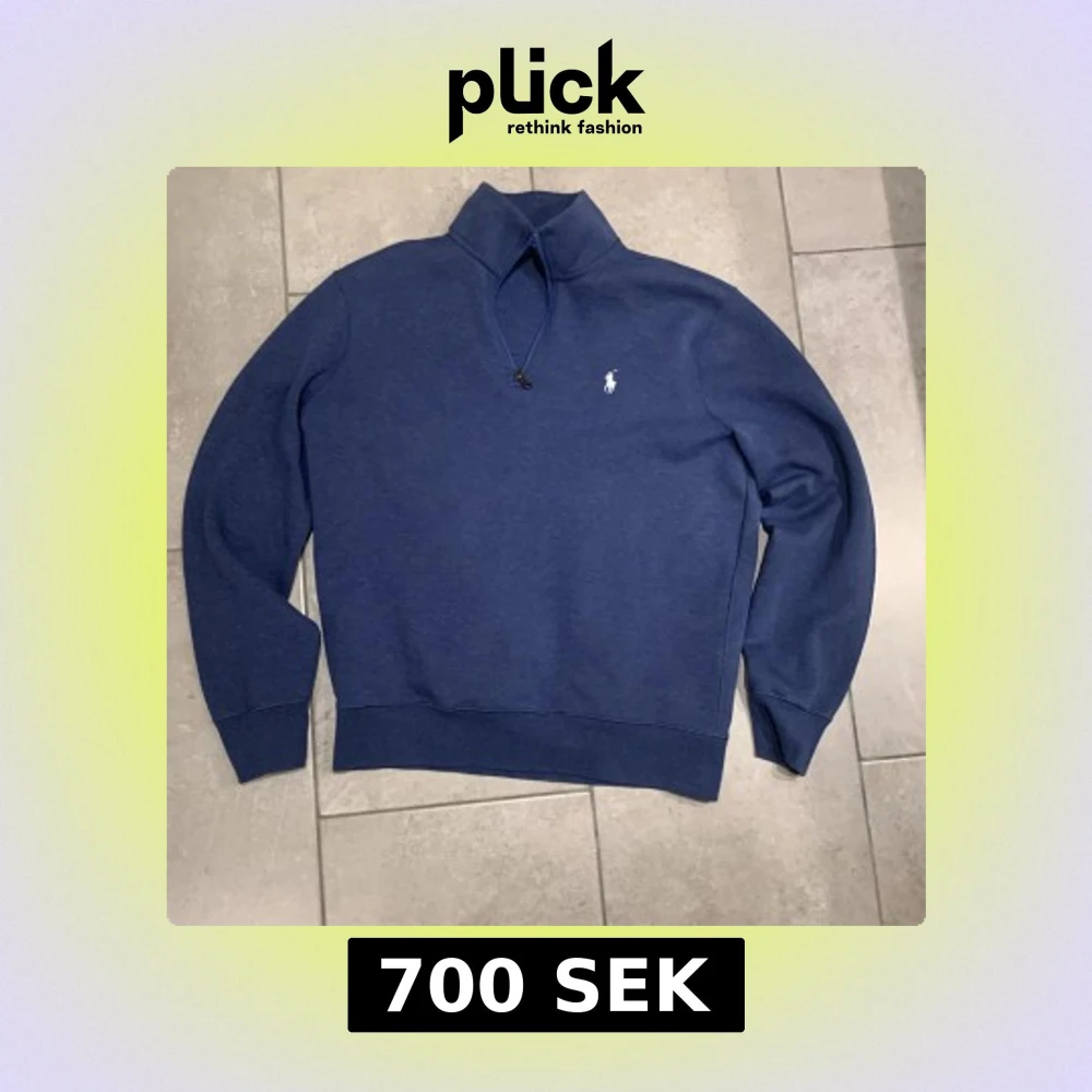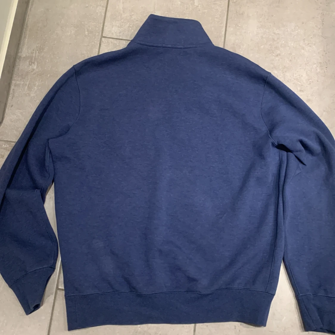 Säljer en marinblå långärmad tröja från Polo Ralph Lauren med klassisk vit broderad logga på bröstet. Tröjan har en hög krage med half zip-dragkedja och är tillverkad i mjuk bomull. Perfekt för dig som gillar stilren och sportig look.
