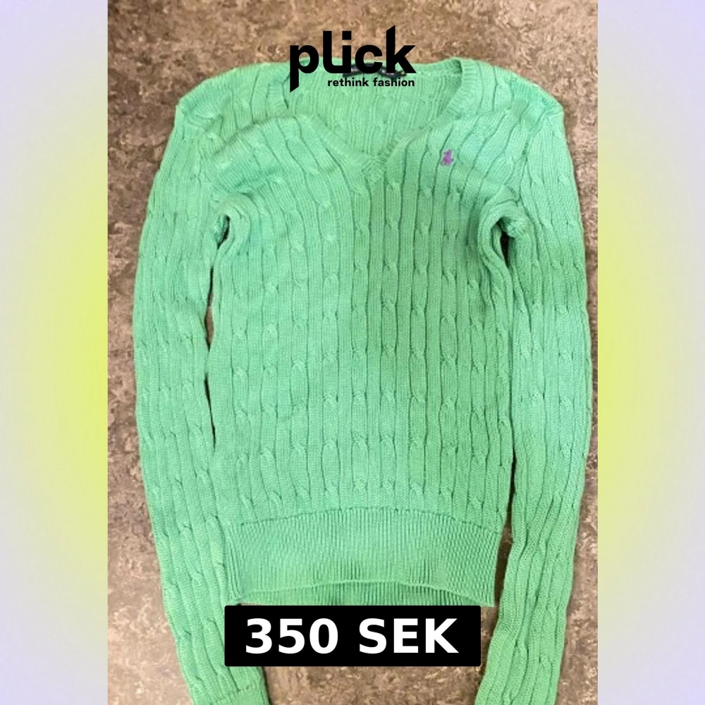 Oanvänd Snygg grön stickad tröja från Ralph Lauren med klassiskt kabelmönster och lila broderad logga på bröstet. Tröjan har v-ringad hals, långa ärmar och ribbade muddar vid ärmslut och nederkant. Perfekt för dig som gillar klassisk stil!💕🗽( äkta såklart)