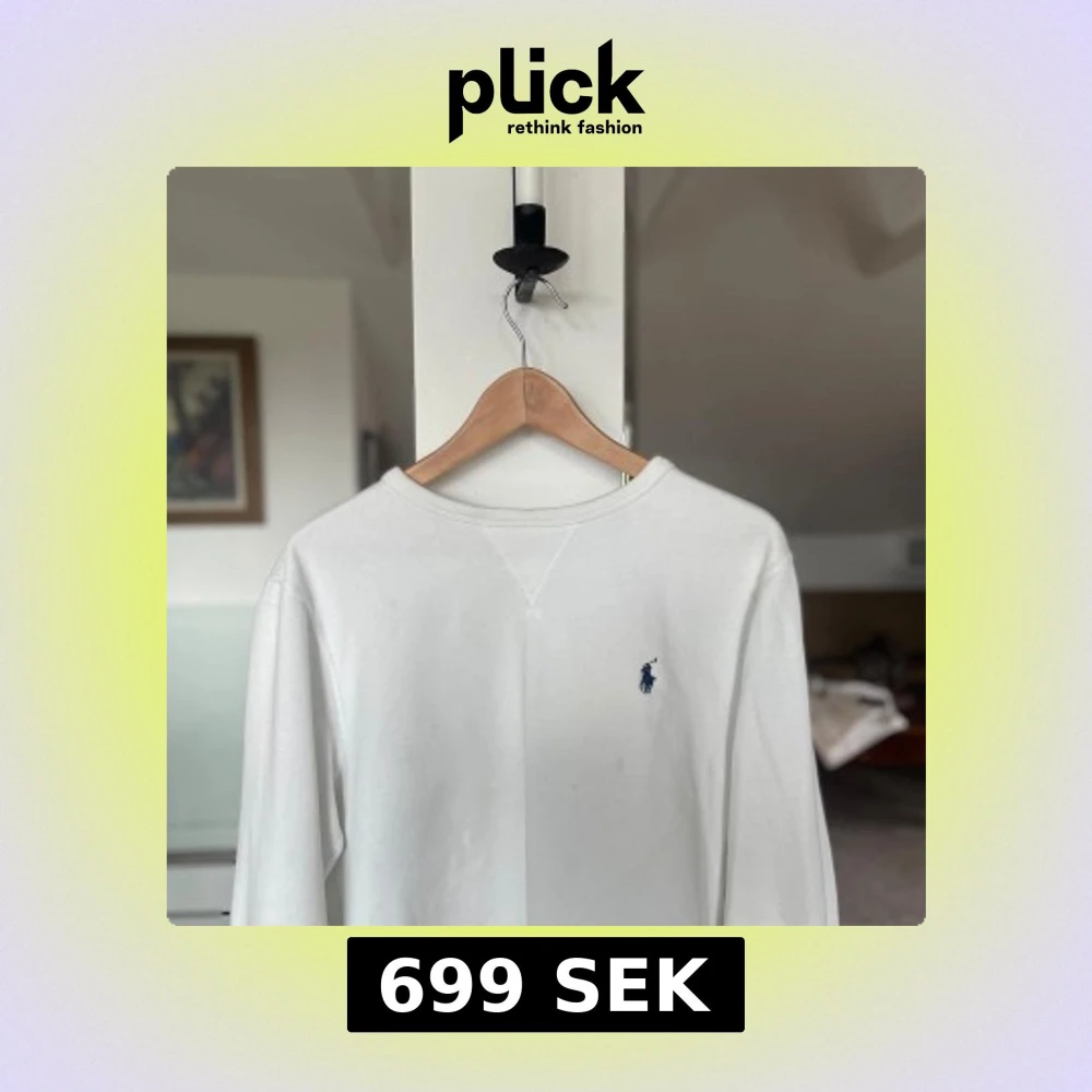 Säljer en klassisk vit långärmad tröja från Ralph Lauren med det ikoniska blå broderade logotypen på bröstet. Perfekt för en stilren och avslappnad look.