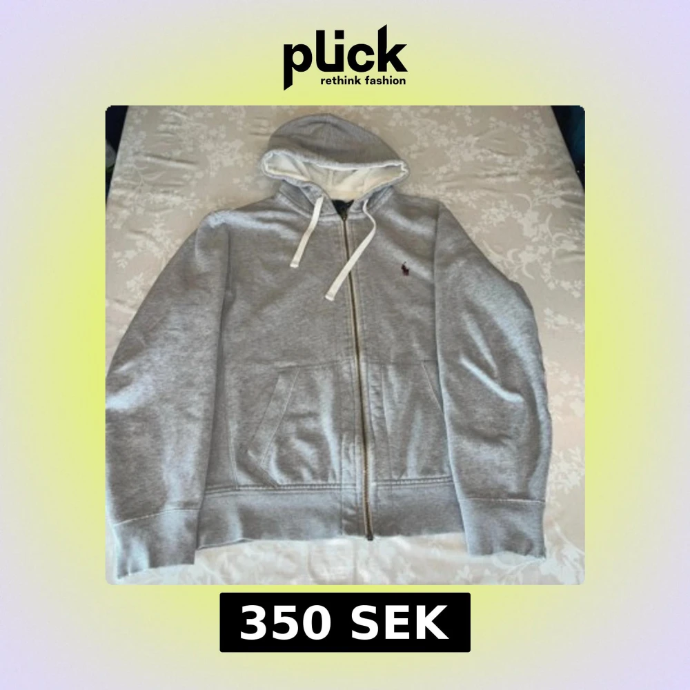 Klassisk grå hoodie från Polo Ralph Lauren med dragkedja, vit snörning i huvan och broderad logga på bröstet. Mjuk insida och känguruficka framtill. Tillverkad i bomull och polyester, perfekt för chill dagar. Lite trasig vid sömnen vid armen ser på sista bilderna