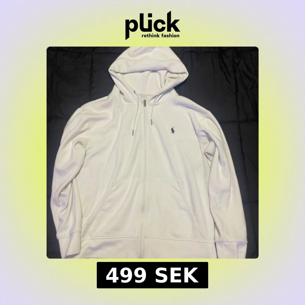 Säljer en stilren vit hoodie från Ralph Lauren med dragkedja och klassisk logga på bröstet. Tröjan har långa ärmar och en praktisk huva med snörning. Perfekt för en avslappnad look.