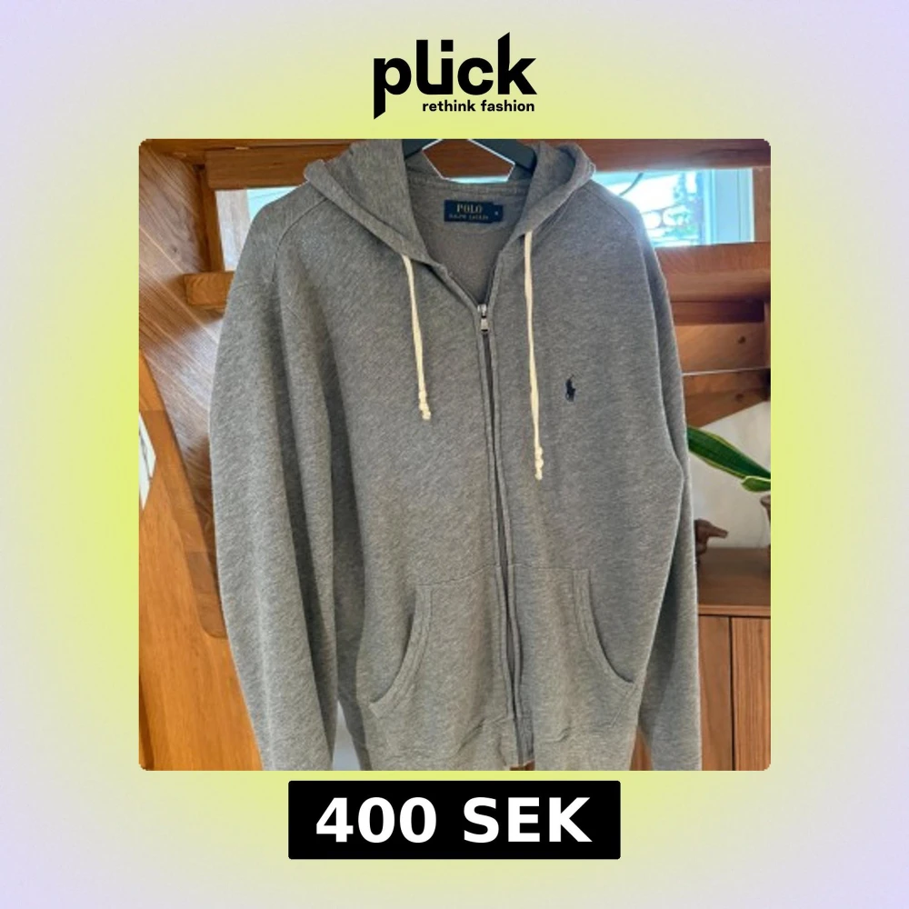 Grå hoodie från Polo Ralph Lauren med dragkedja, huva och vita snören. broderad logga på bröstet och två fickor framtill. Bra passform och i storlek M