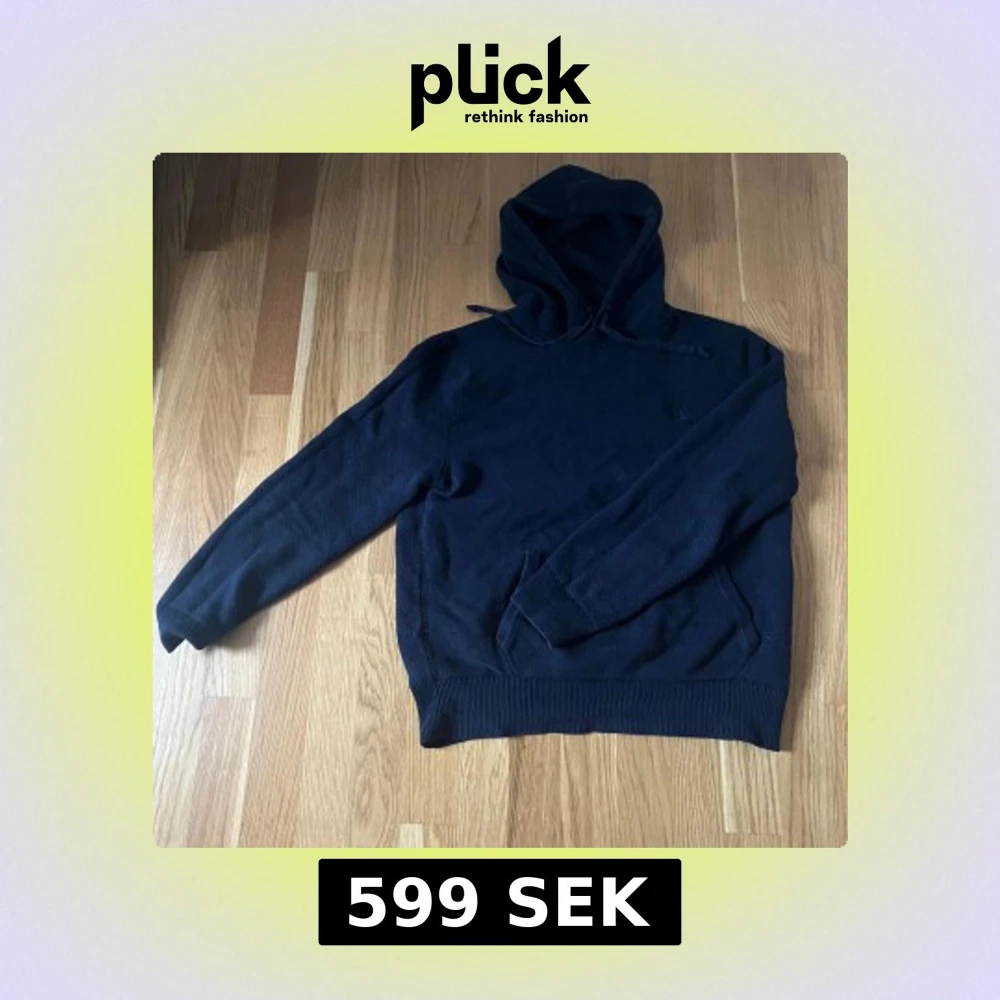 Mysig mörkblå stickad hoodie med huva och dragsko. Tröjan har långa ärmar och ribbade muddar vid ärmslut och nederkant. Perfekt för kyliga dagar när du vill vara både bekväm och snygg. Storlek M men sitter som S-M