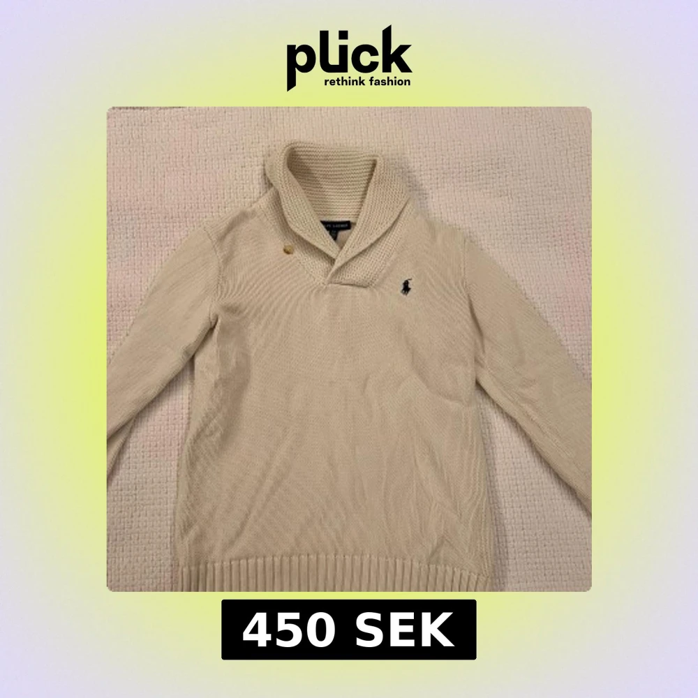 Säljer en beige stickad tröja från Ralph Lauren med klassisk sjalkrage och en knappdetalj vid halsen. Tröjan har lång ärm, ribbade muddar och den ikoniska broderade loggan på bröstet. Perfekt för dig som gillar stilren och tidlös design.