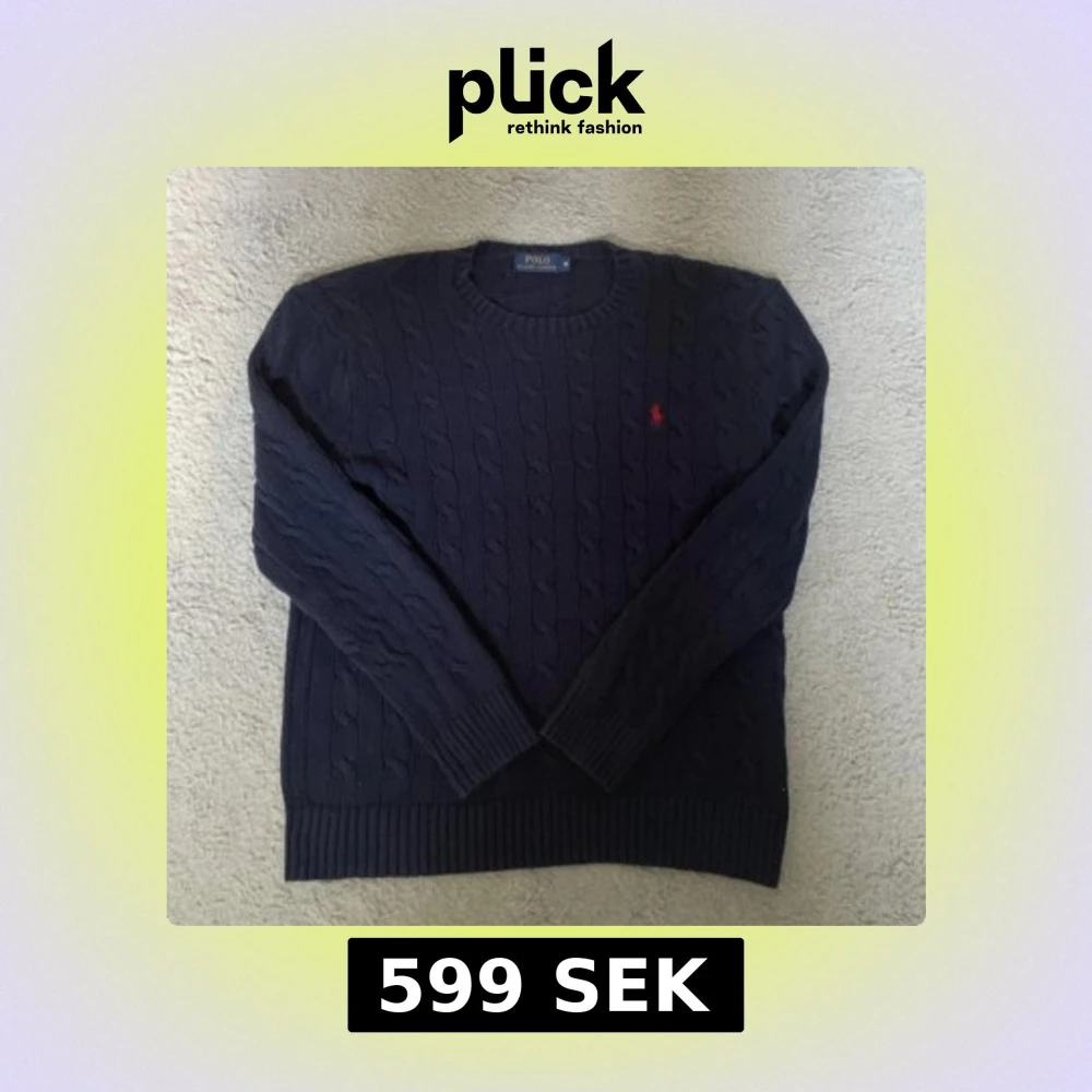 Snygg marinblå stickad tröja från Polo Ralph Lauren i storlek M. Tröjan har klassiskt kabelstickat mönster, rund hals och den ikoniska röda Polo-loggan broderad på bröstet. Perfekt för dig som gillar stilrena och tidlösa plagg.