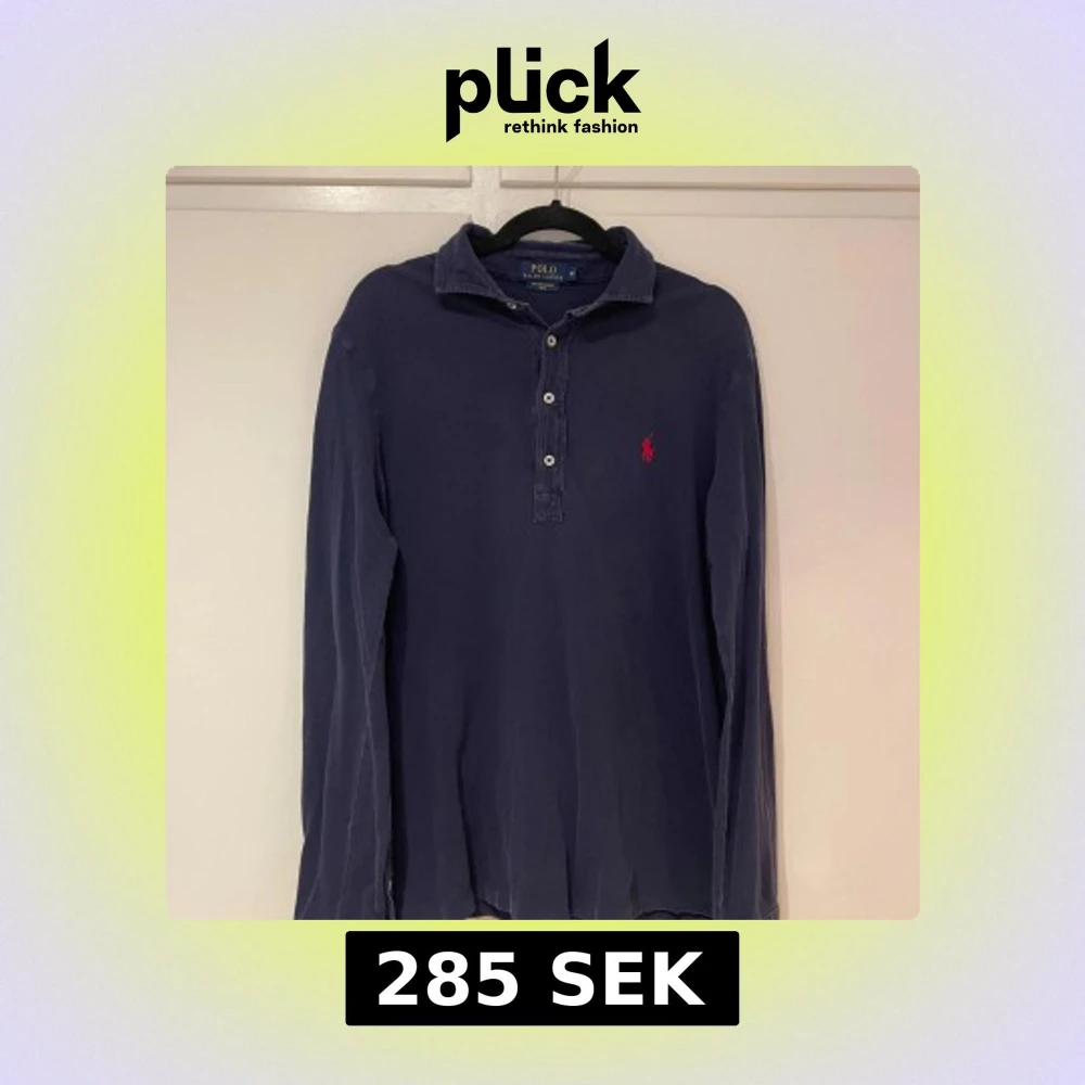 Säljer en klassisk blå långärmad pikétröja från Ralph Lauren. Tröjan har en krage med knappar och det ikoniska röda broderade logotypen på bröstet. Perfekt för en stilren och avslappnad look.