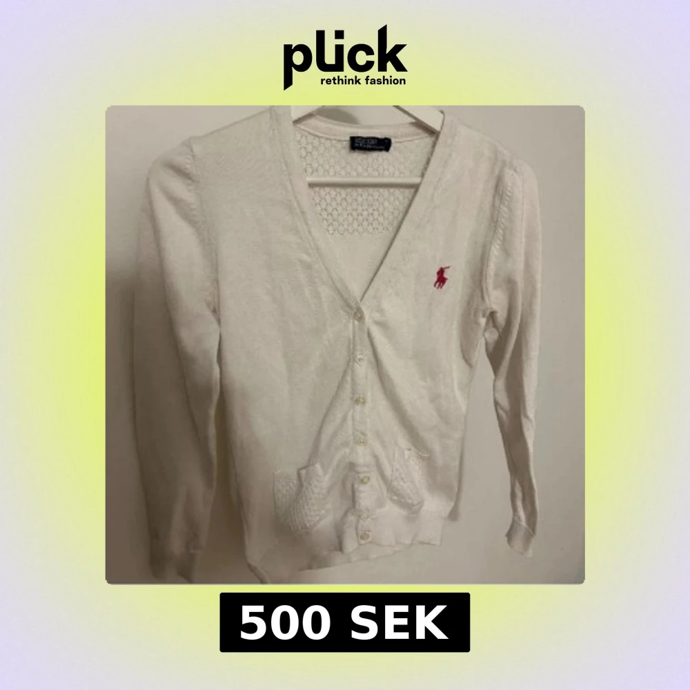 Vit kofta från Ralph Lauren med v-ringning och knappar framtill. Tröjan har två stickade fickor och den klassiska rosa broderade loggan på bröstet. Långärmad och mjuk i bomull, perfekt för lager på lager under höst och vår. Passar även en person som bär S