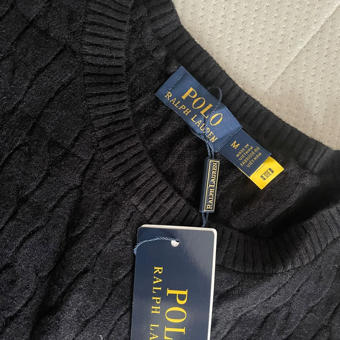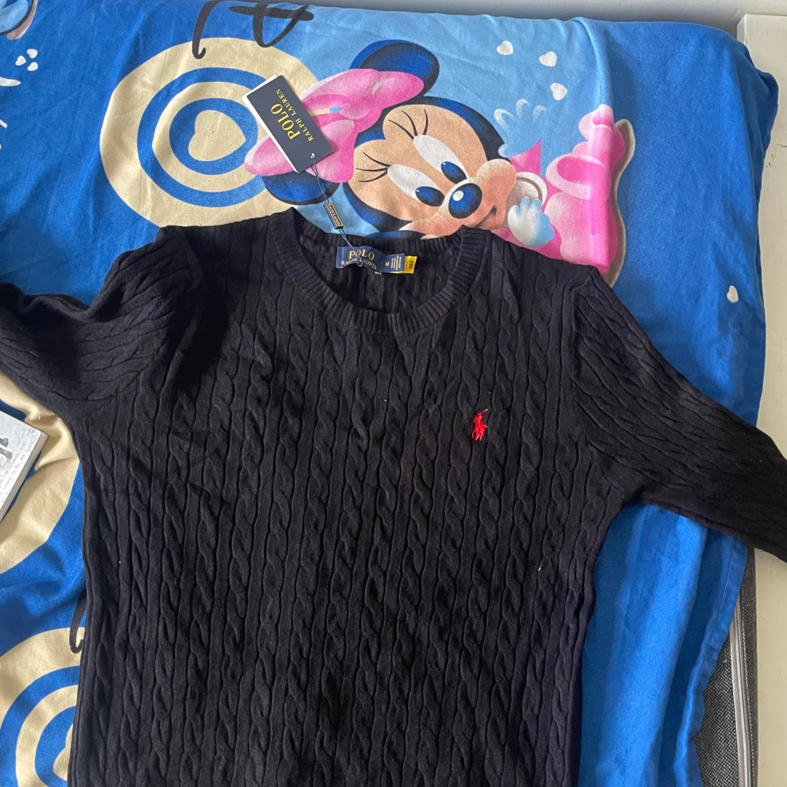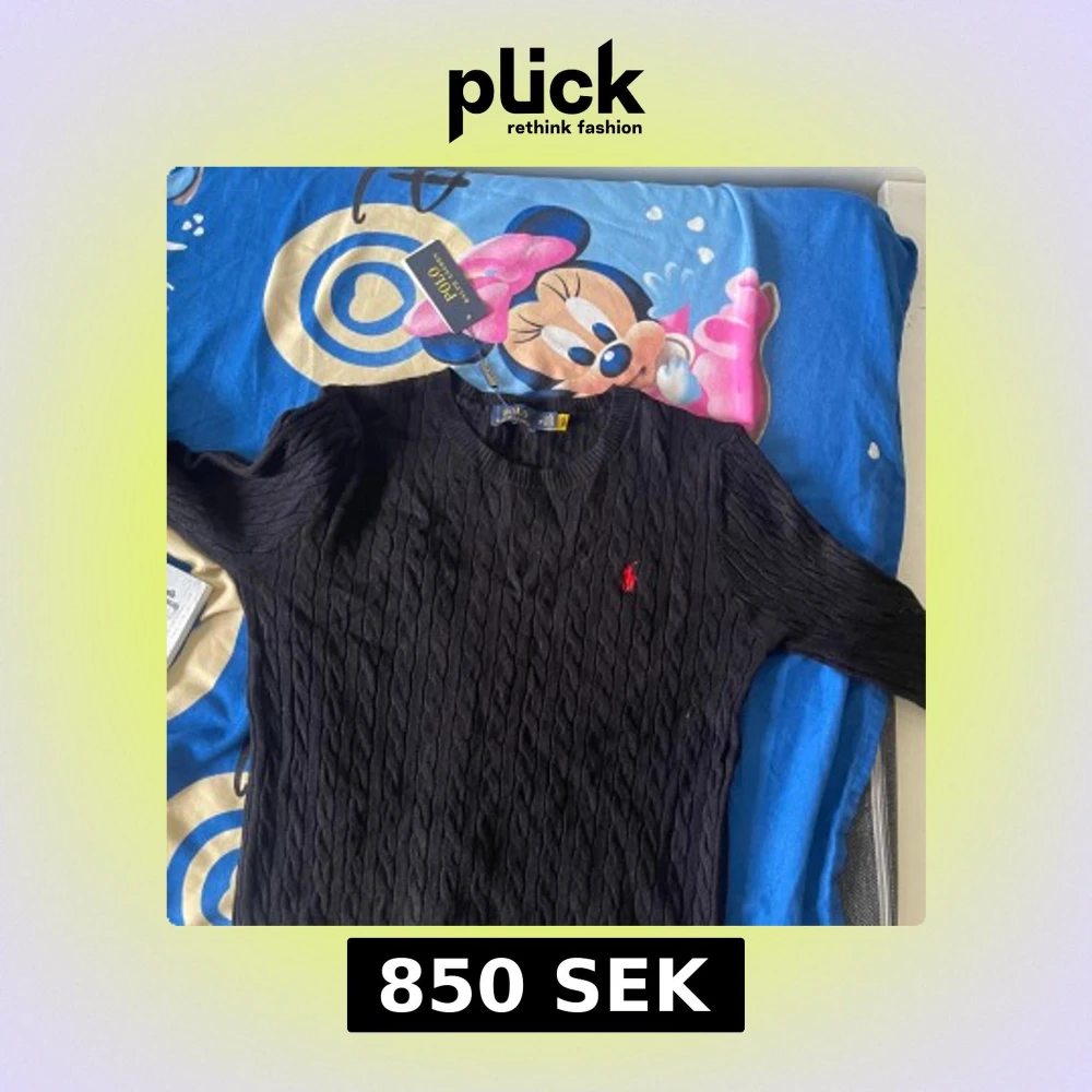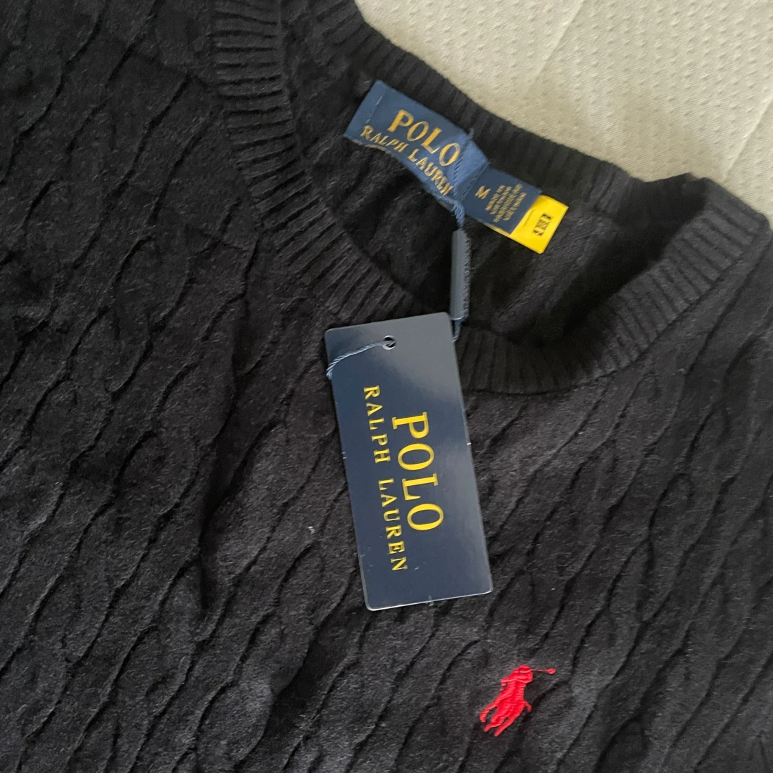 Svart kabelstickad tröja från Polo Ralph Lauren med klassisk rund halsringning och röd broderad logga på bröstet. Tröjan är i mjuk bomull och har långa ärmar. Perfekt för dig som gillar stilren och tidlös design.
