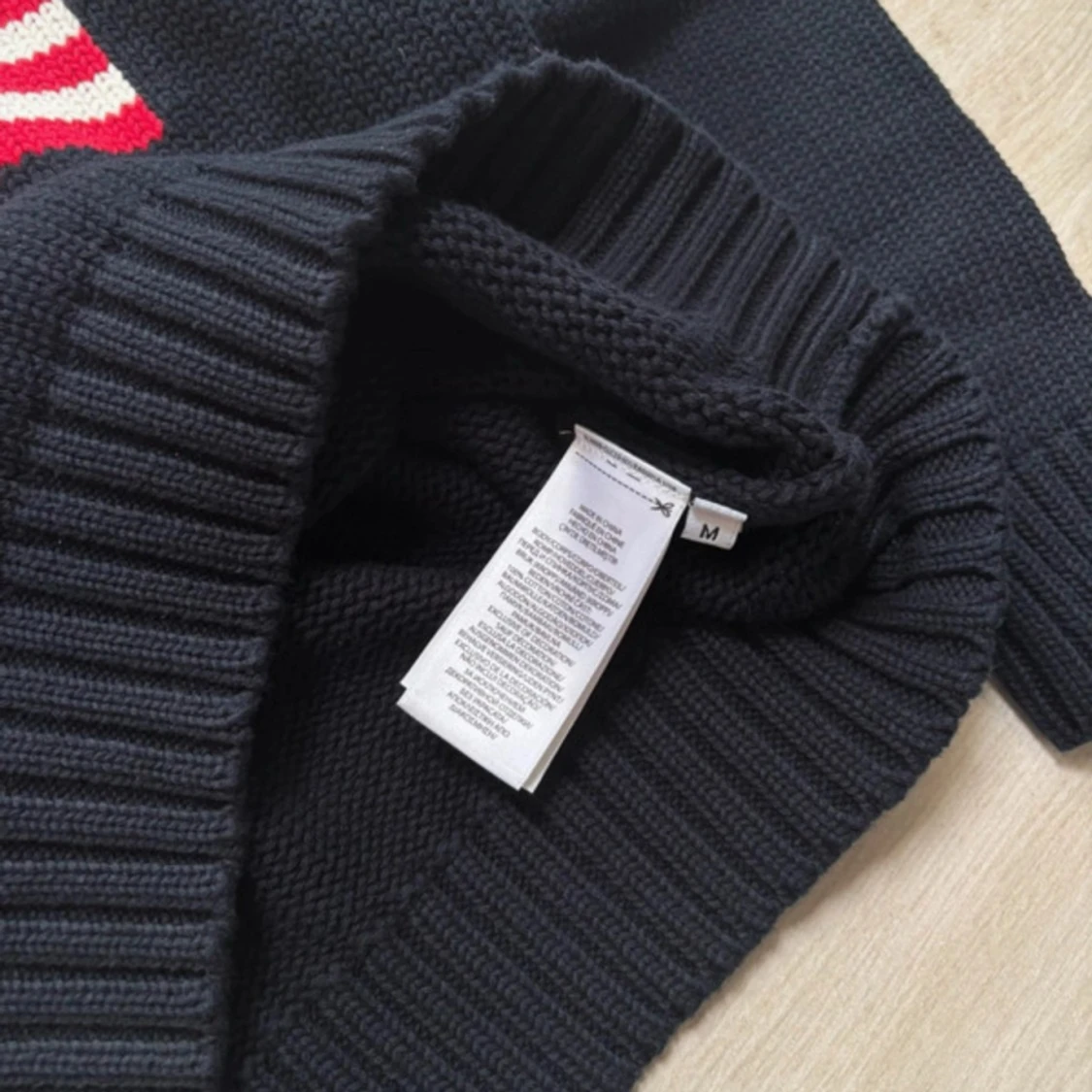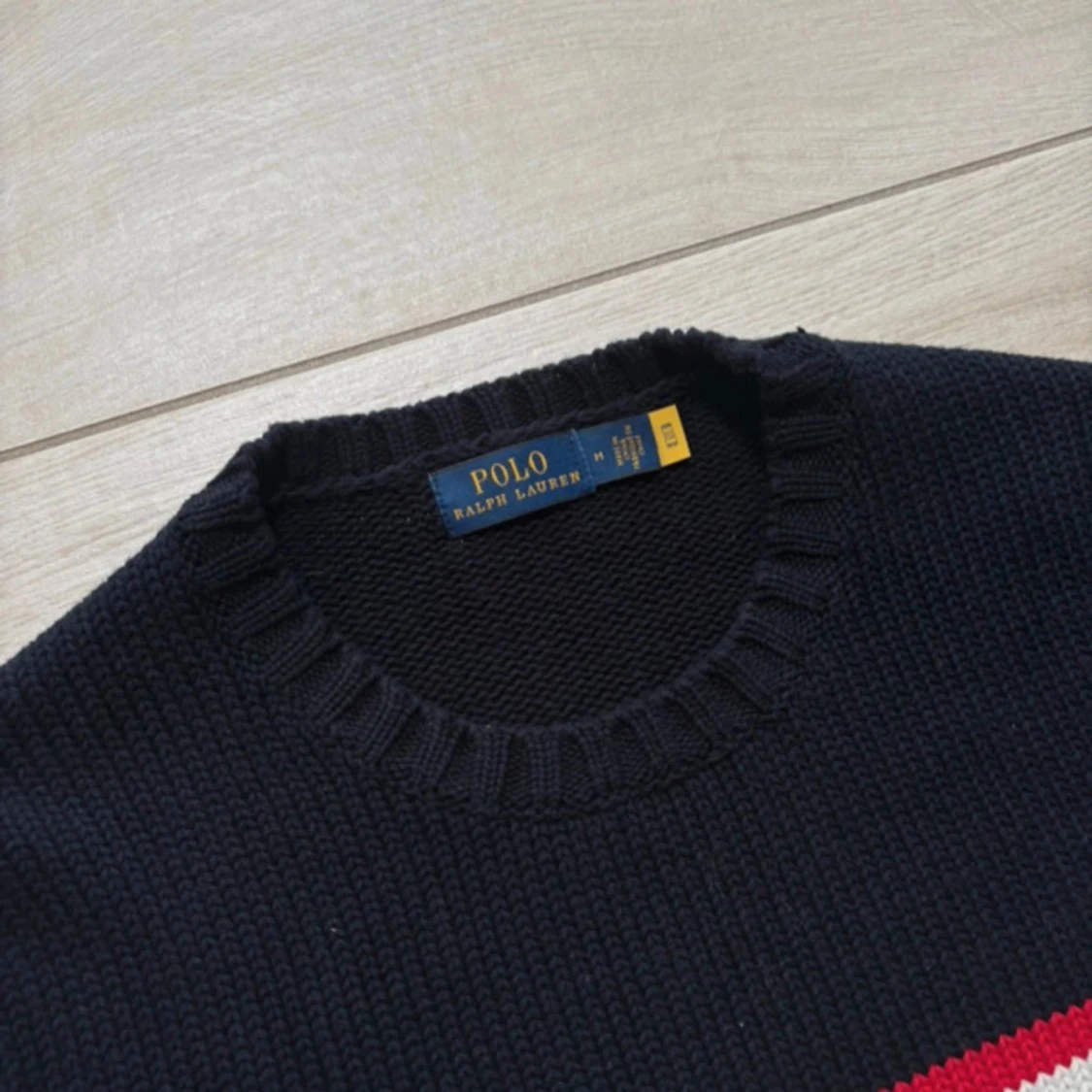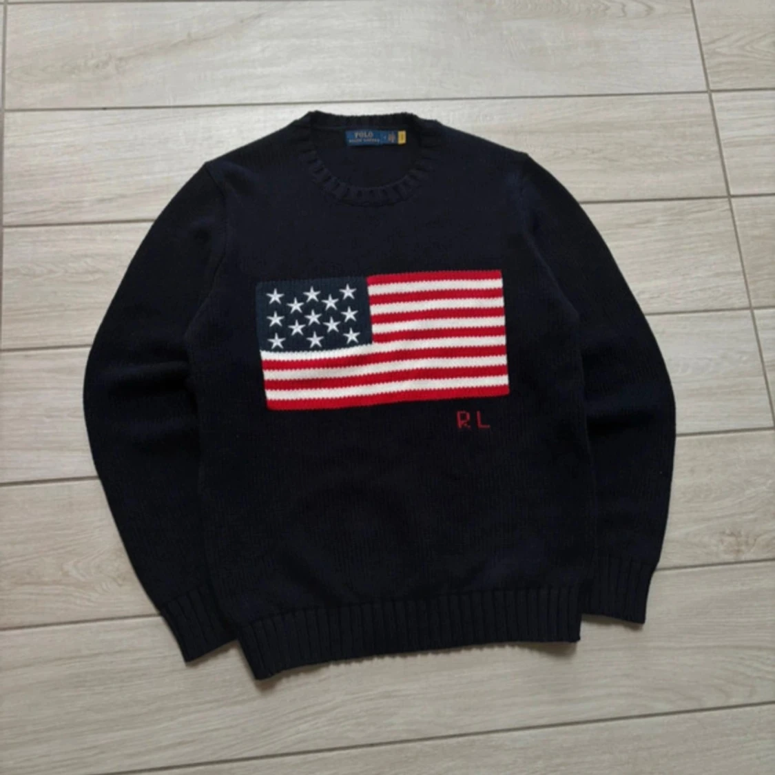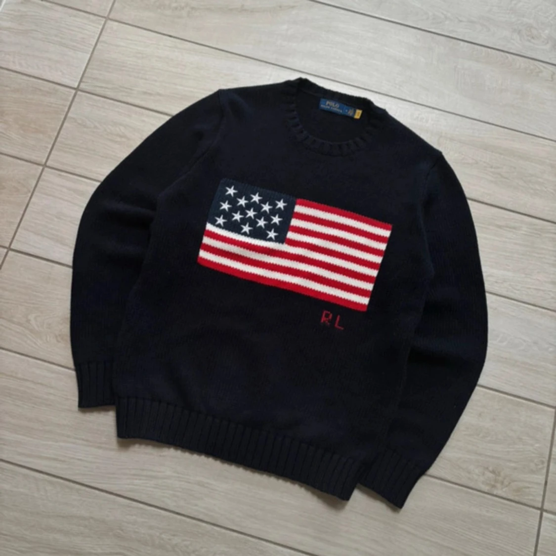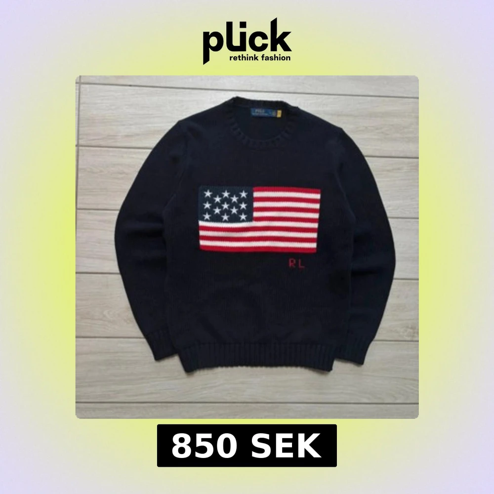 Säljer en mörkblå stickad tröja från Polo Ralph Lauren med amerikansk flagga framtill och RL-broderi. Tröjan har rund halsringning och ribbade muddar vid ärmslut och nederkant. Tröjan är helt ny storlek M