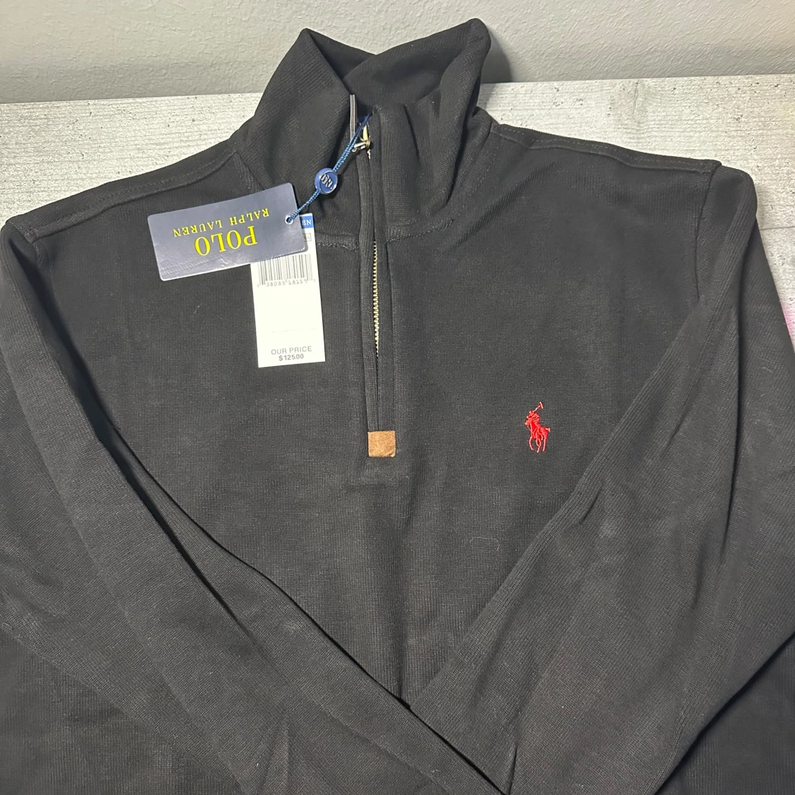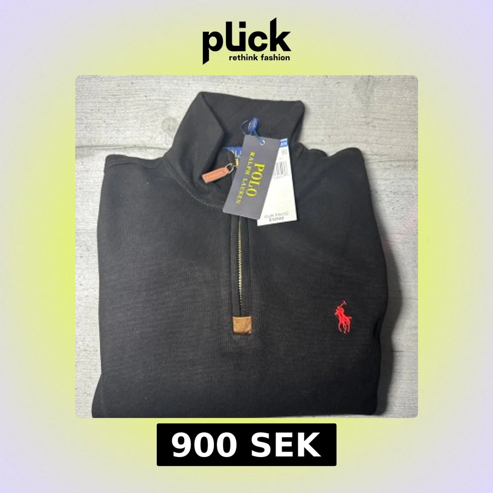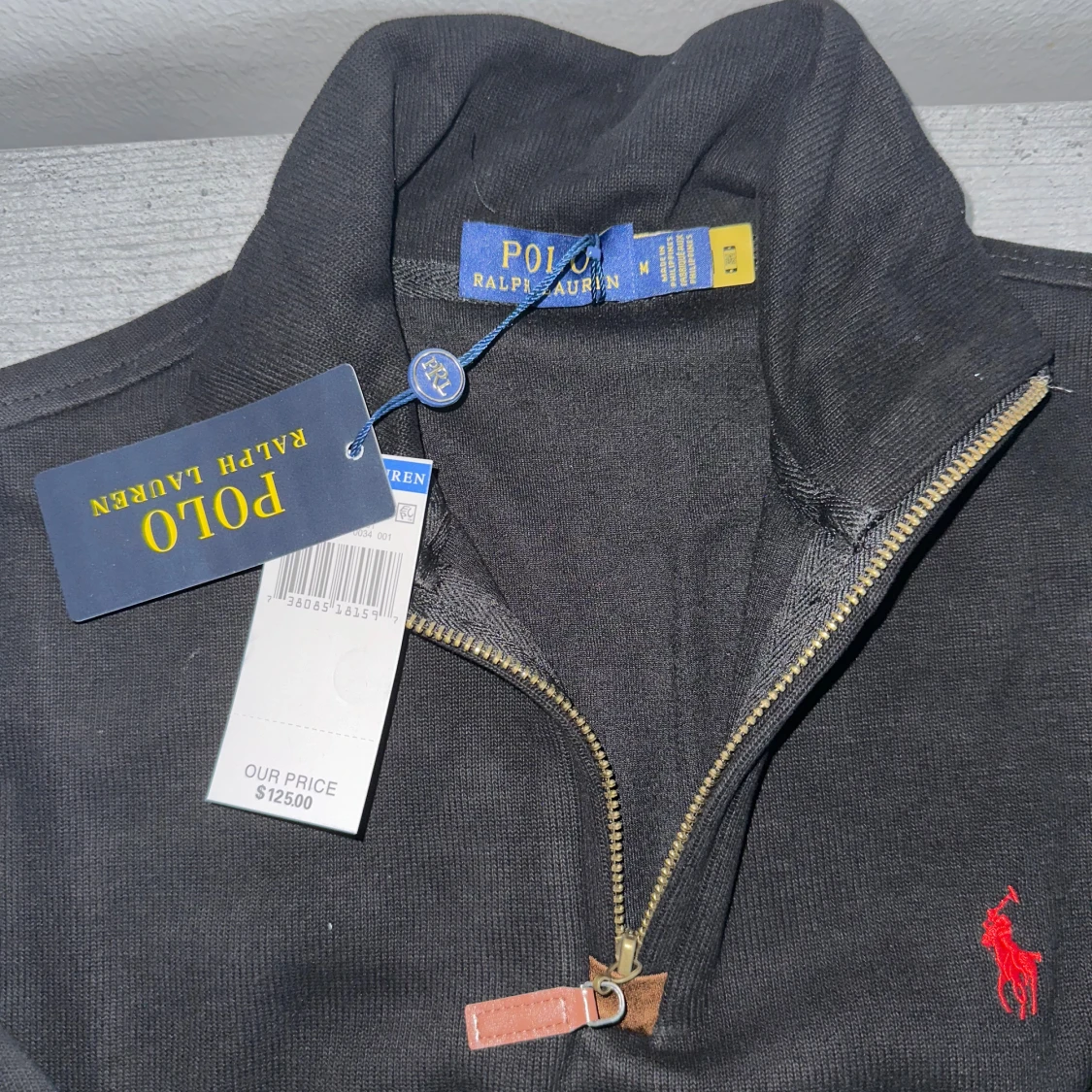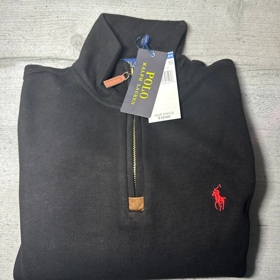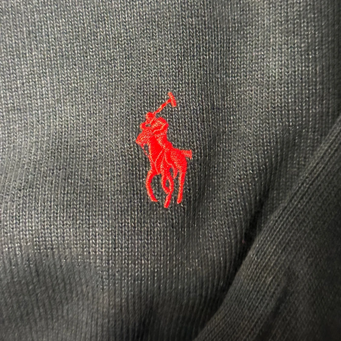 Svart långärmad tröja från Polo Ralph Lauren med röd broderad logga på bröstet. Tröjan har en snygg half zip-dragkedja med läderdetalj och hög krage. Tillverkad i mjuk bomull, perfekt för lager-på-lager under höst och vinter. Tröjan är ALDRIG använd! Nu pris är 125$ köpt på kryssning