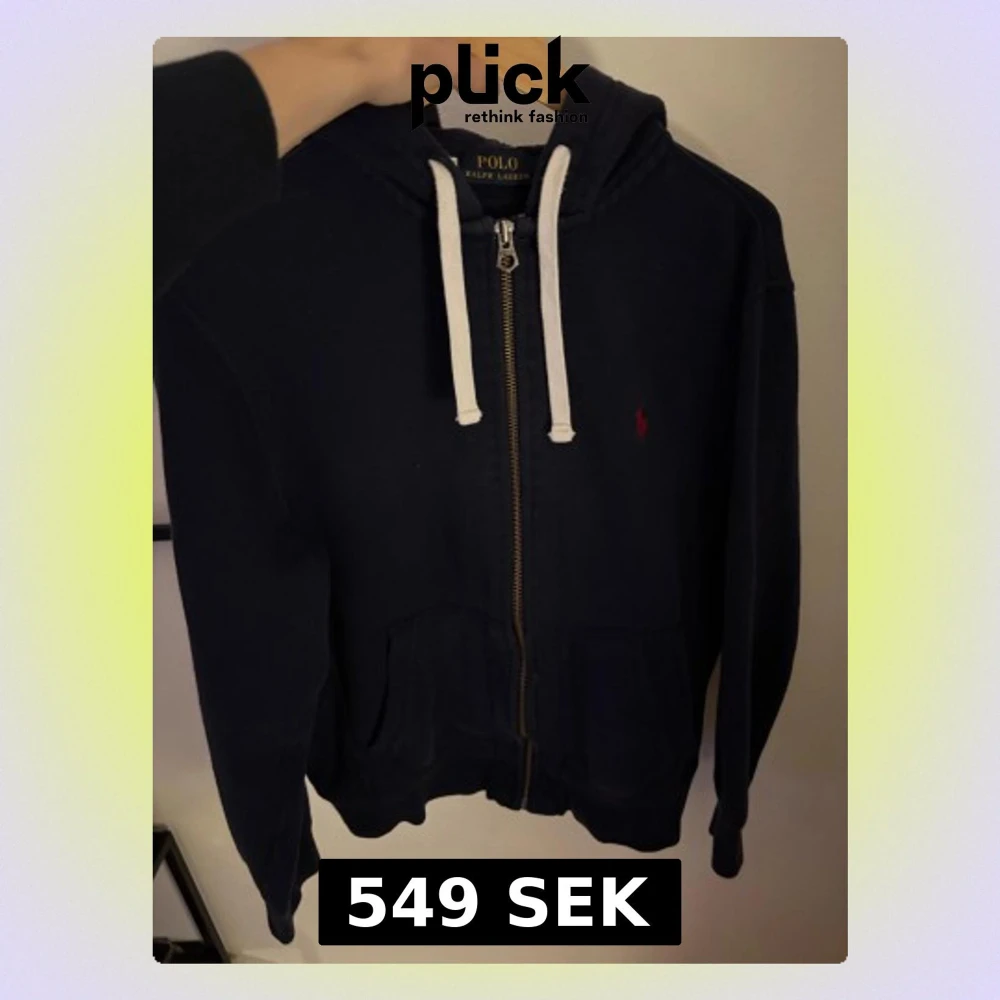 Säljer en mörkblå hoodie från Polo Ralph Lauren med dragkedja och vit snörning i huvan. Klassisk röd logga broderad på bröstet och stora fickor framtill. Perfekt för dig som gillar en chill och stilren look.