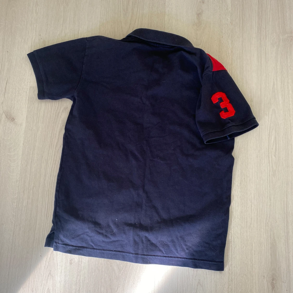 Snygg pikétröja från Ralph Lauren i storlek M. Tröjan är tvåfärgad med ena sidan röd och andra svart, har stor röd logga på bröstet och siffran 3 på ärmen. Klassisk krage och korta ärmar. Tillverkad i 100% bomull.
