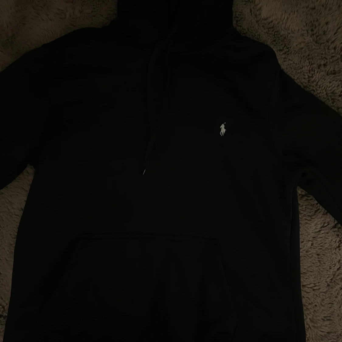 Svart hoodie från Polo Ralph Lauren med klassisk vit broderad logga på bröstet. Tröjan har huva med snörning och en stor magficka framtill. Perfekt för dig som gillar stilren och enkel streetwear.