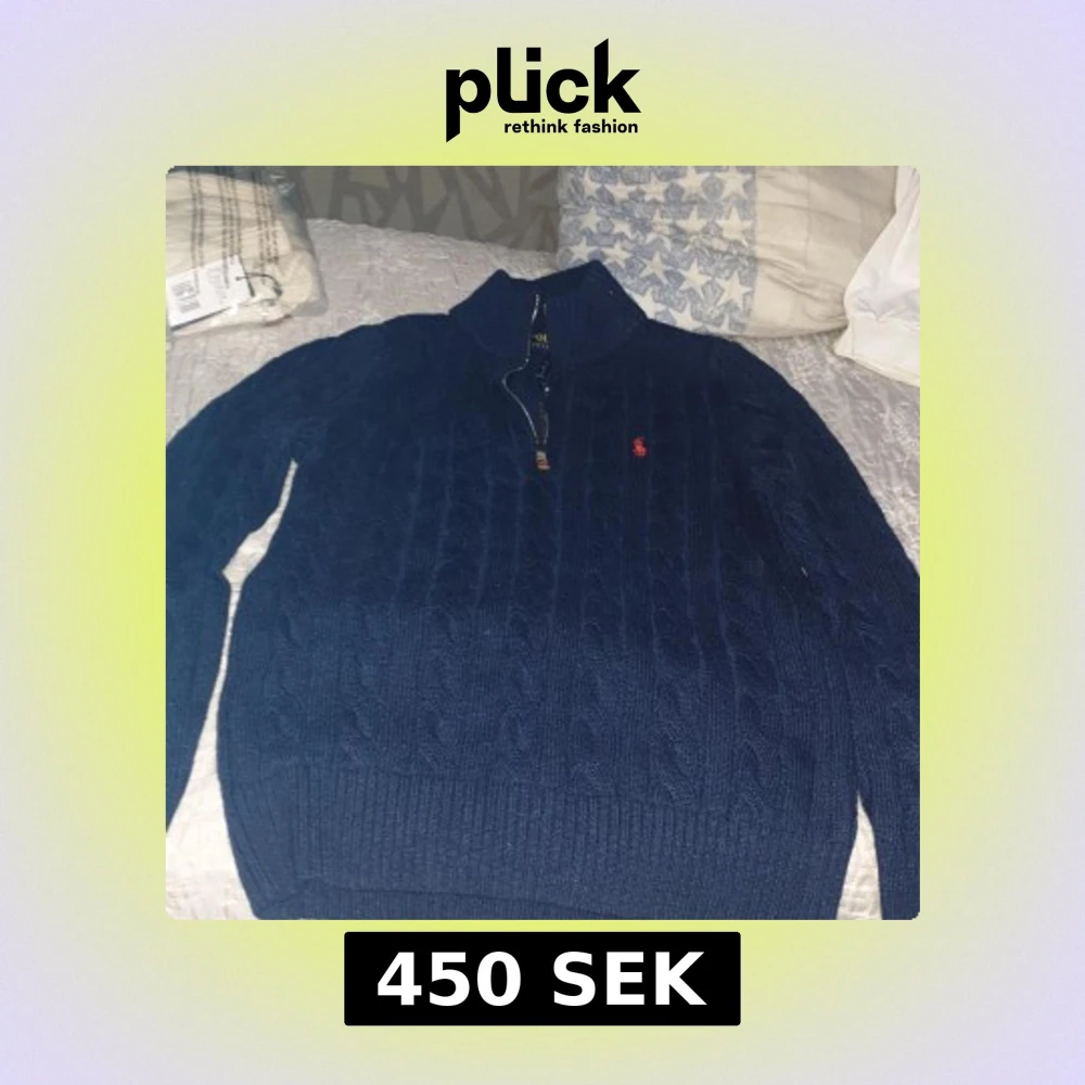 Säljer en marinblå stickad tröja från Polo Ralph Lauren med klassiskt kabelstickat mönster och halv dragkedja vid halsen. Tröjan har lång ärm, ribbade muddar och den ikoniska röda Polo-loggan broderad på bröstet. Perfekt för dig som gillar stilren och tidlös design.