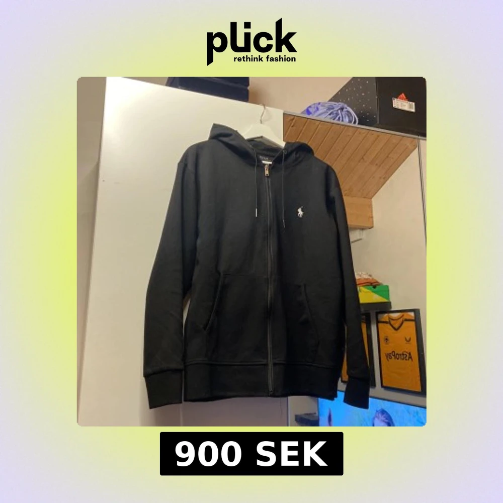Säljer en stilren svart hoodie från Ralph Lauren med dragkedja och huva. Den har en broderad logga på bröstet och är tillverkad i mjukt material. Perfekt för en avslappnad look.